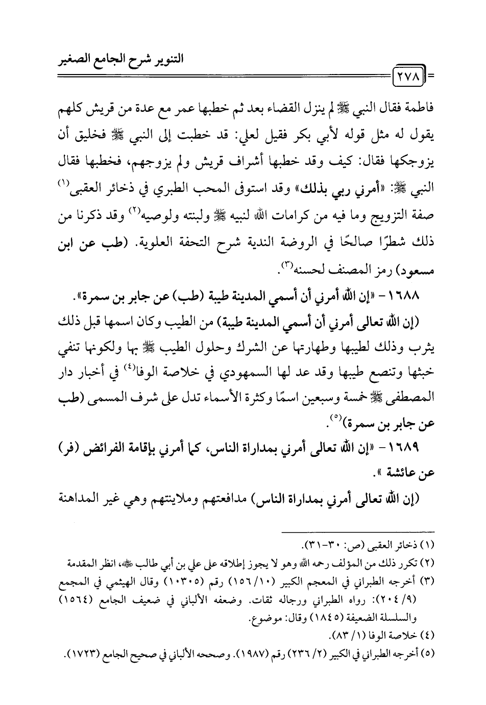 فاطمة فقال النبي - صلى الله عليه وسلم - لم ينزل القضاء بعد ثم خطبها عمر مع عدة من قريش كلهم يقول له مثل قوله لأبي بكر فقيل لعلي: قد خطبت إلى النبي - صلى الله عليه وسلم - فخليق أن يزوجكها فقال: كيف وقد خطبها أشراف قريش ولم يزوجهم، فخطبها فقال النبي - صلى الله عليه وسلم -: "أمرني ربي بذلك" وقد استوفى المحب الطبري في ذخائر العقبى (¬1) صفة التزويج وما فيه من كرامات الله لنبيه - صلى الله عليه وسلم - ولبنته ولوصيه (¬2) وقد ذكرنا من ذلك شطرًا صالحًا في الروضة الندية شرح التحفة العلوية. (طب عن ابن مسعود) رمز المصنف لحسنه (¬3).