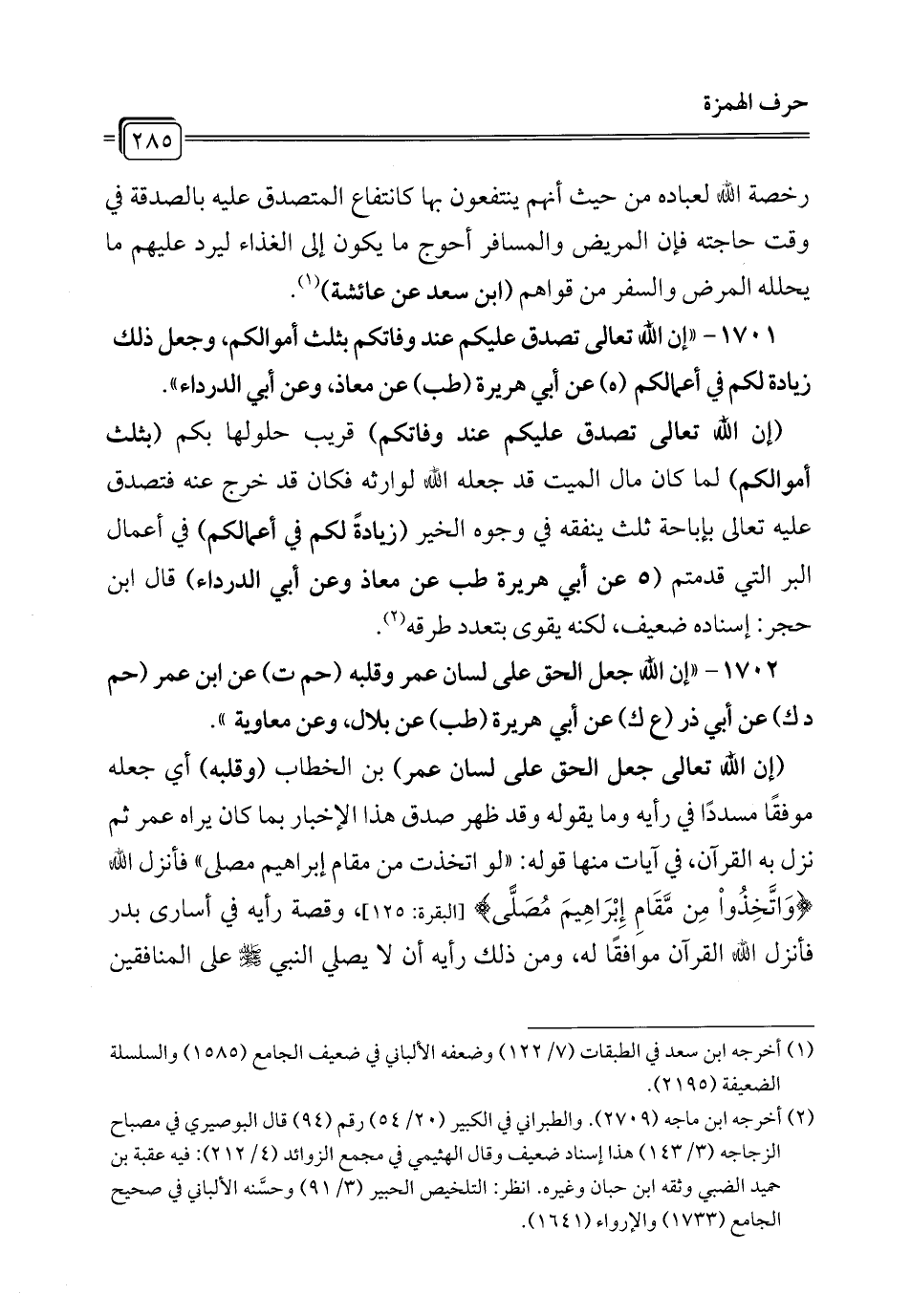 1701 - "إن الله تعالى تصدق عليكم عند وفاتكم بثلث أموالكم، وجعل ذلك زيادة لكم في أعمالكم (هـ) عن أبي هريرة (طب) عن معاذ، وعن أبي الدرداء ".