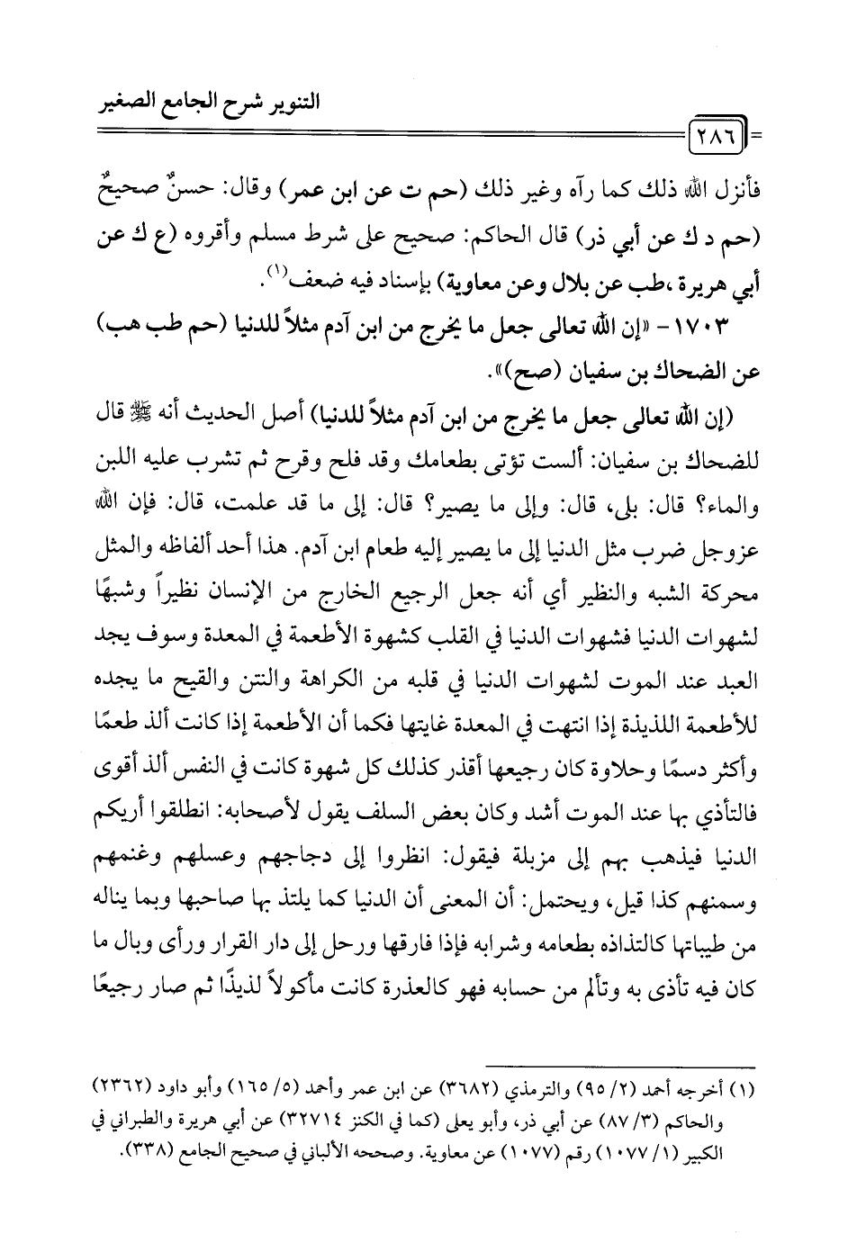 1703 - "إن الله تعالى جعل ما يخرج من ابن آدم مثلاً للدنيا (حم طب هب) عن الضحاك بن سفيان (صح) ".