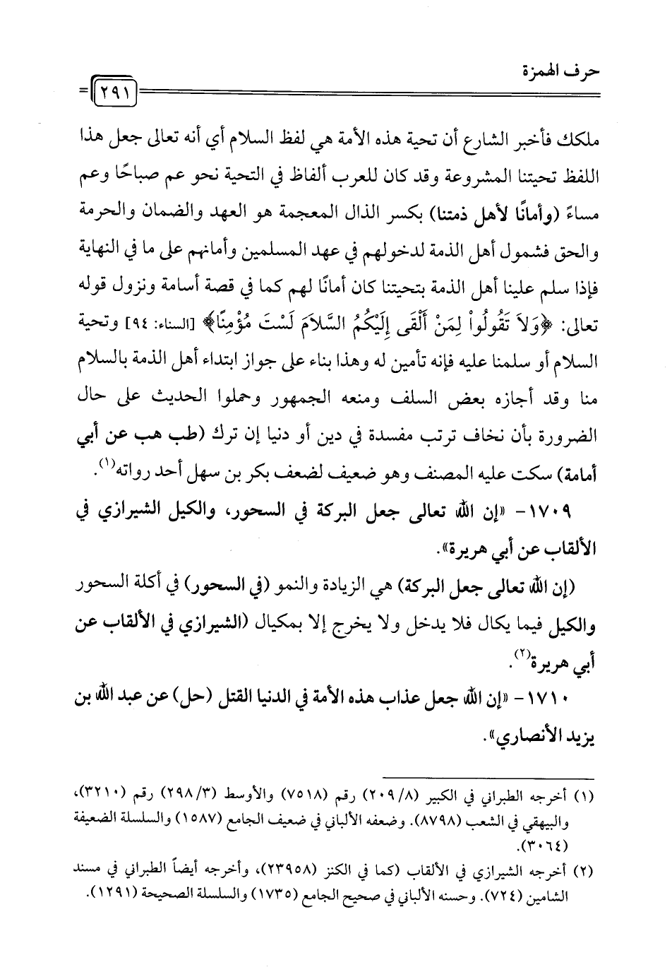 1709 - "إن الله تعالى جعل البركة في السحور، والكيل الشيرازي في الألقاب عن أبي هريرة".