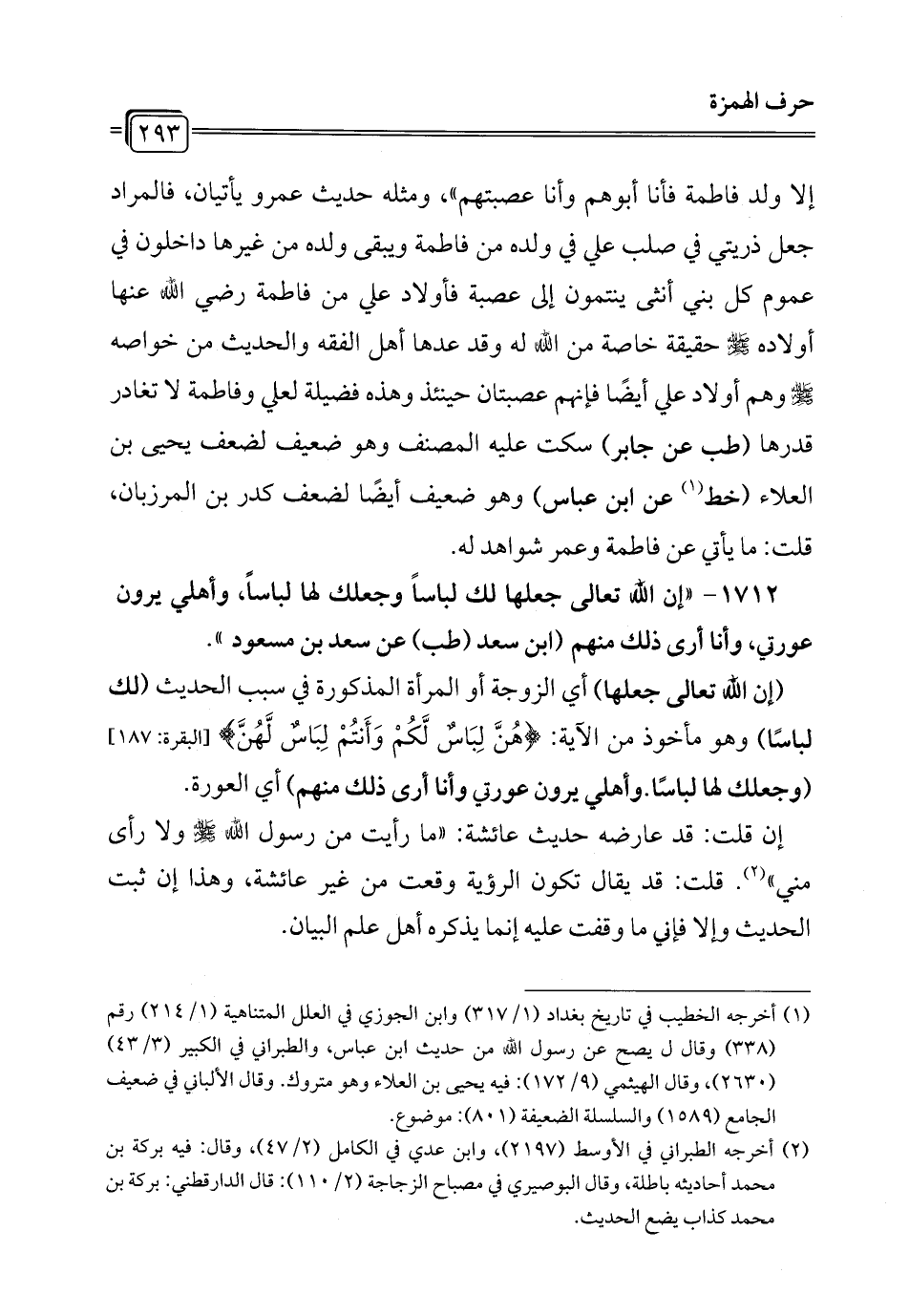 1712 - "إن الله تعالى جعلها لك لباساً وجعلك لها لباساً، وأهلي يرون عورتي، وأنا أرى ذلك منهم (ابن سعد (طب) عن سعد بن مسعود ".