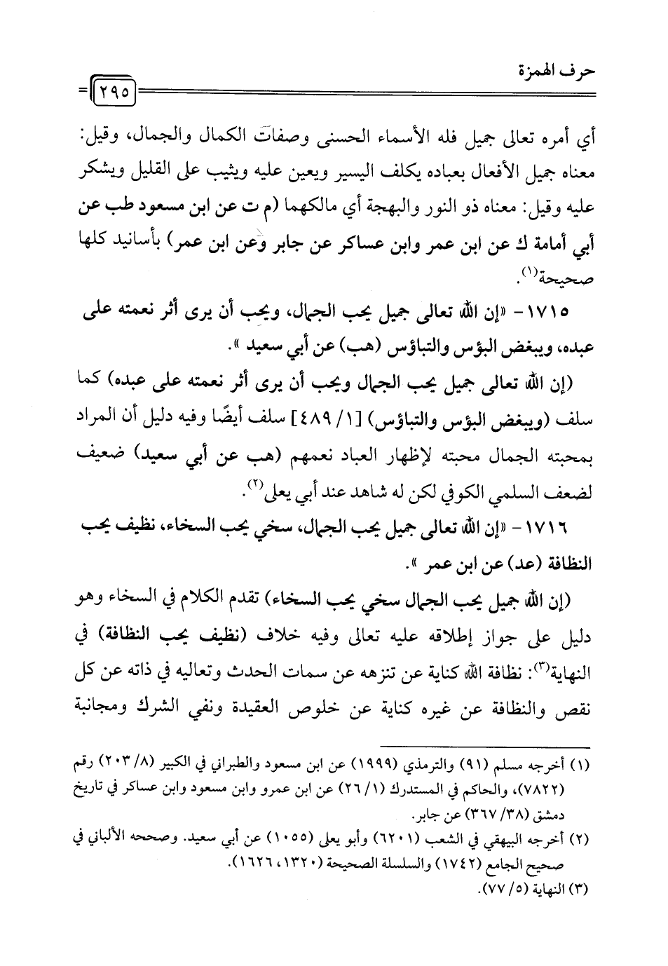 (إن الله جميل يحب الجمال سخي يحب السخاء) تقدم الكلام في السخاء وهو دليل على جواز إطلاقه عليه تعالى وفيه خلاف (نظيف يحب النظافة) في النهاية (¬3): نظافة الله كناية عن تنزهه عن سمات الحدث وتعاليه في ذاته عن كل نقص والنظافة عن غيره كناية عن خلوص العقيدة ونفي الشرك ومجانبة