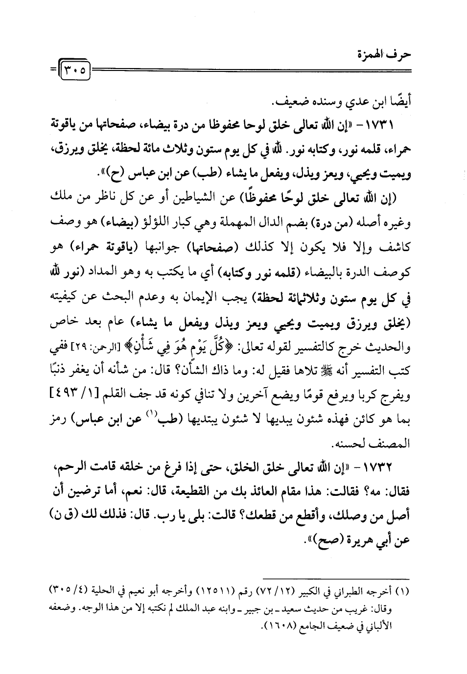 1731 - "إن الله تعالى خلق لوحا محفوظا من درة بيضاء، صفحاتها من ياقوتة حمراء، قلمه نور، وكتابه نور. لله في كل يوم ستون وثلاث مائة لحظة، يخلق ويرزق، ويميت ويحيى، ويعز ويذل، ويفعل ما يشاء (طب) عن ابن عباس (ح) ".