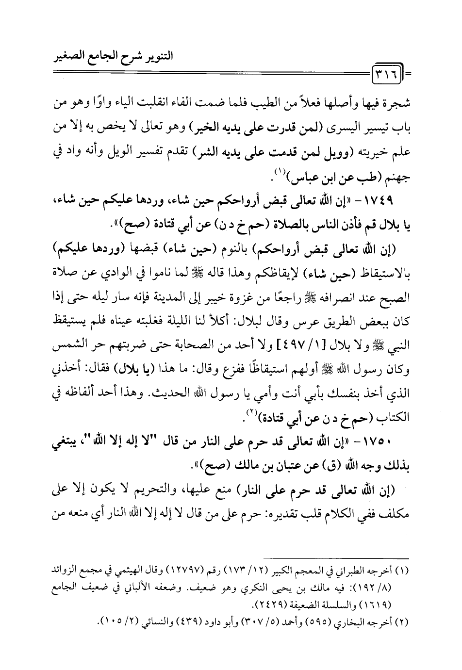 1749 - "إن الله تعالى قبض أرواحكم حين شاء، وردها عليكم حين شاء، يا بلال قم فأذن الناس بالصلاة (حم خ د ن) عن أبي قتادة (صح) ".