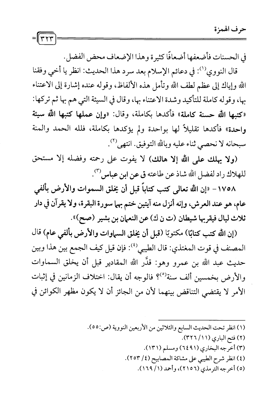 1758 - "إن الله تعالى كتب كتاباً قبل أن يخلق السماوات والأرض بألفي عام، هو عند العرش، وإنه أنزل منه آيتين ختم بهما سورة البقرة، ولا يقرآن في دار ثلاث ليالي فيقربها شيطان (ت ن ك) عن النعمان بن بشير (صح) ".