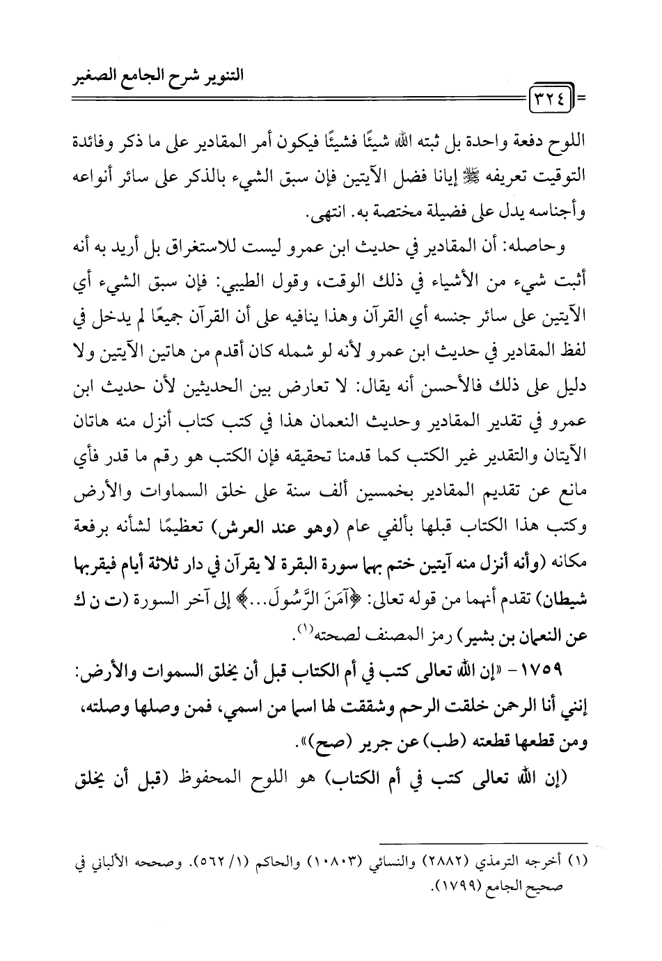 وحاصله: أن المقادير في حديث ابن عمرو ليست للاستغراق بل أريد به أنه أثبت شيء من الأشياء في ذلك الوقت، وقول الطيبي: فإن سبق الشيء أي الآيتين على سائر جنسه أي القرآن وهذا ينافيه على أن القرآن جميعًا لم يدخل في لفظ المقادير في حديث ابن عمرو لأنه لو شمله كان أقدم من هاتين الآيتين ولا دليل على ذلك فالأحسن أنه يقال: لا تعارض بين الحديثين لأن حديث ابن عمرو في تقدير المقادير وحديث النعمان هذا في كتب كتاب أنزل منه هاتان الآيتان والتقدير غير الكتب كما قدمنا تحقيقه فإن الكتب هو رقم ما قدر فأي مانع عن تقديم المقادير بخمسين ألف سنة على خلق السماوات والأرض وكتب هذا الكتاب قبلها بألفي عام (وهو عند العرش) تعظيمًا لشأنه برفعة مكانه (وأنه أنزل منه آيتين ختم بهما سورة البقرة لا يقرآن في دار ثلاثة أيام فيقربها شيطان) تقدم أنهما من قوله تعالى: {آمَنَ الرَّسُولَ ...} إلى آخر السورة (ت ن ك عن النعمان بن بشير) رمز المصنف لصحته (¬1).