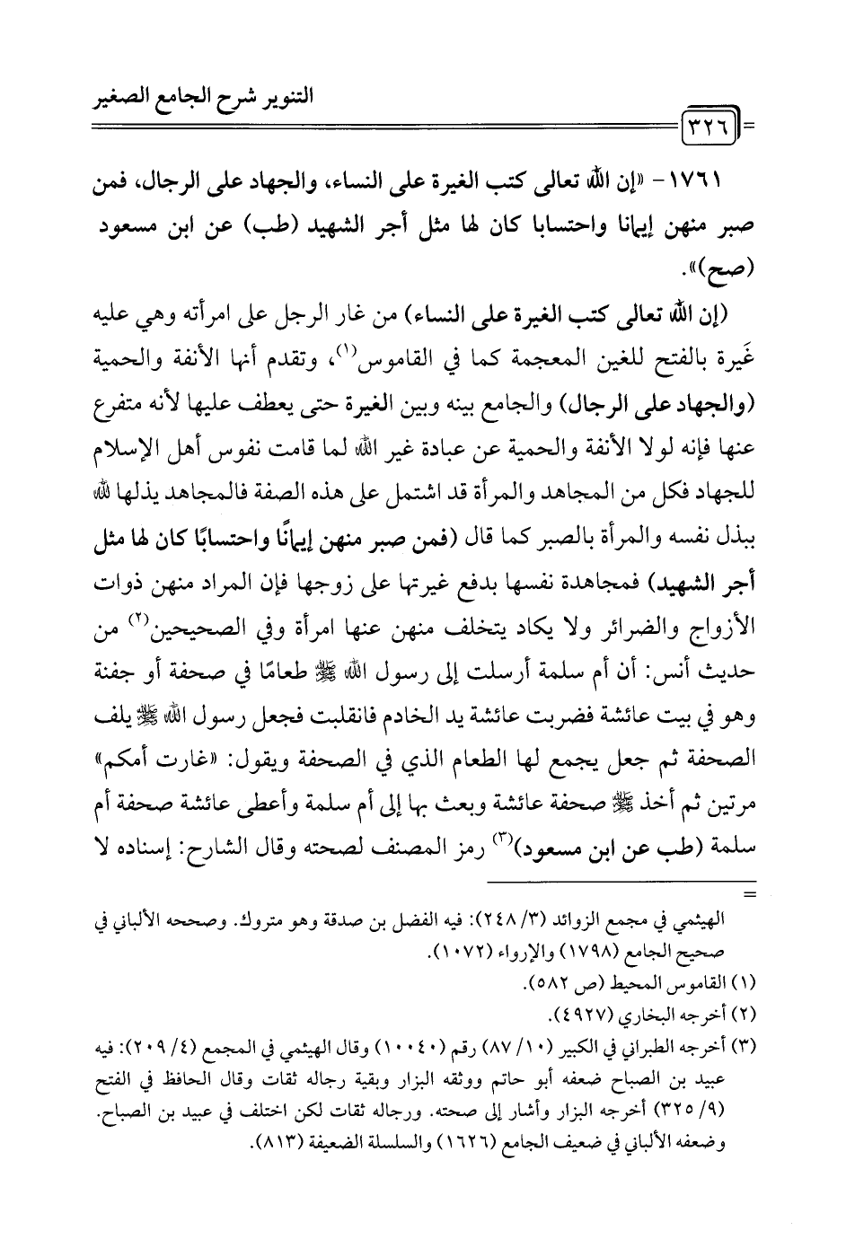 1761 - "إن الله تعالى كتب الغيرة على النساء، والجهاد على الرجال، فمن صبر منهن إيمانا واحتسابا كان لها مثل أجر الشهيد (طب) عن ابن مسعود (صح) ".