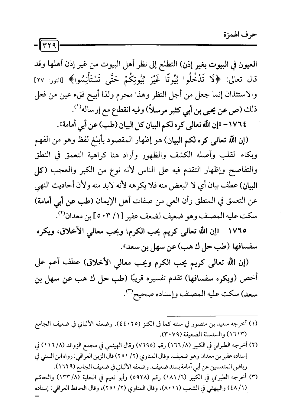 1765 - "إن الله تعالى كريم يحب الكرم، ويحب معالي الأخلاق، ويكره سفسافها (طب حل ك هب) عن سهل بن سعد".