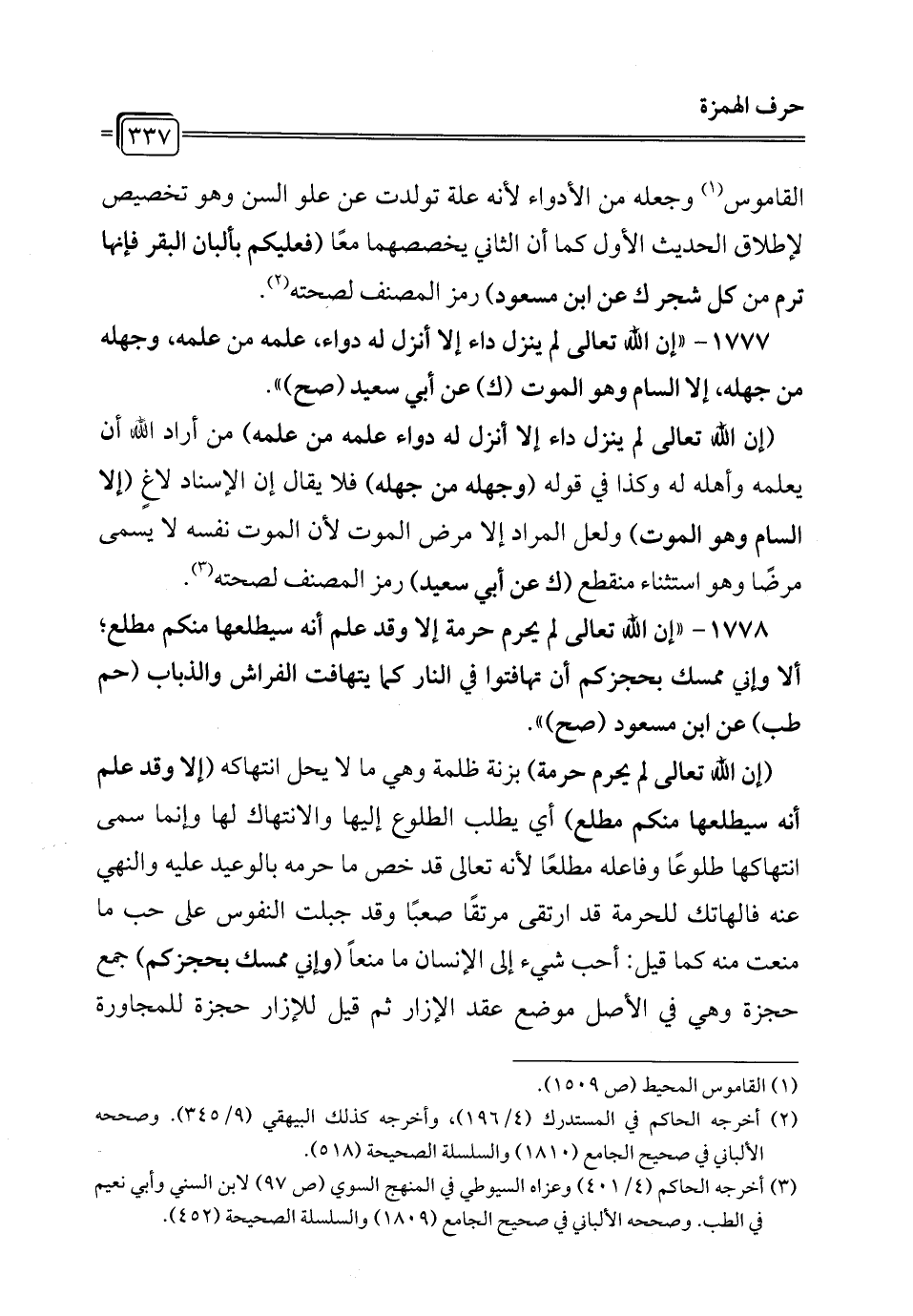 1777 - "إن الله تعالى لم ينزل داء إلا أنزل له دواء، علمه من علمه، وجهله من جهله، إلا السام وهو الموت (ك) عن أبي سعيد (صح) ".