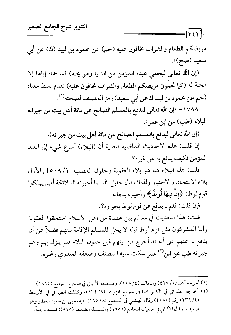 قلت: هذا الحديث في مسلم بين عصاة من أهل الإِسلام استحقوا العقوبة وأما المشركون مثل قوم لوط فإنه لا يحل للمسلم الإقامة بينهم فضلاً عن أن يدفع به عنهم على أنه قد أخرج من بينهم قبل حلول البلاء فلم ينزل بهم وهم جيرانه طب عن ابن (¬2) عمر سكت عليه المصنف وضعفه المنذري وغيره.