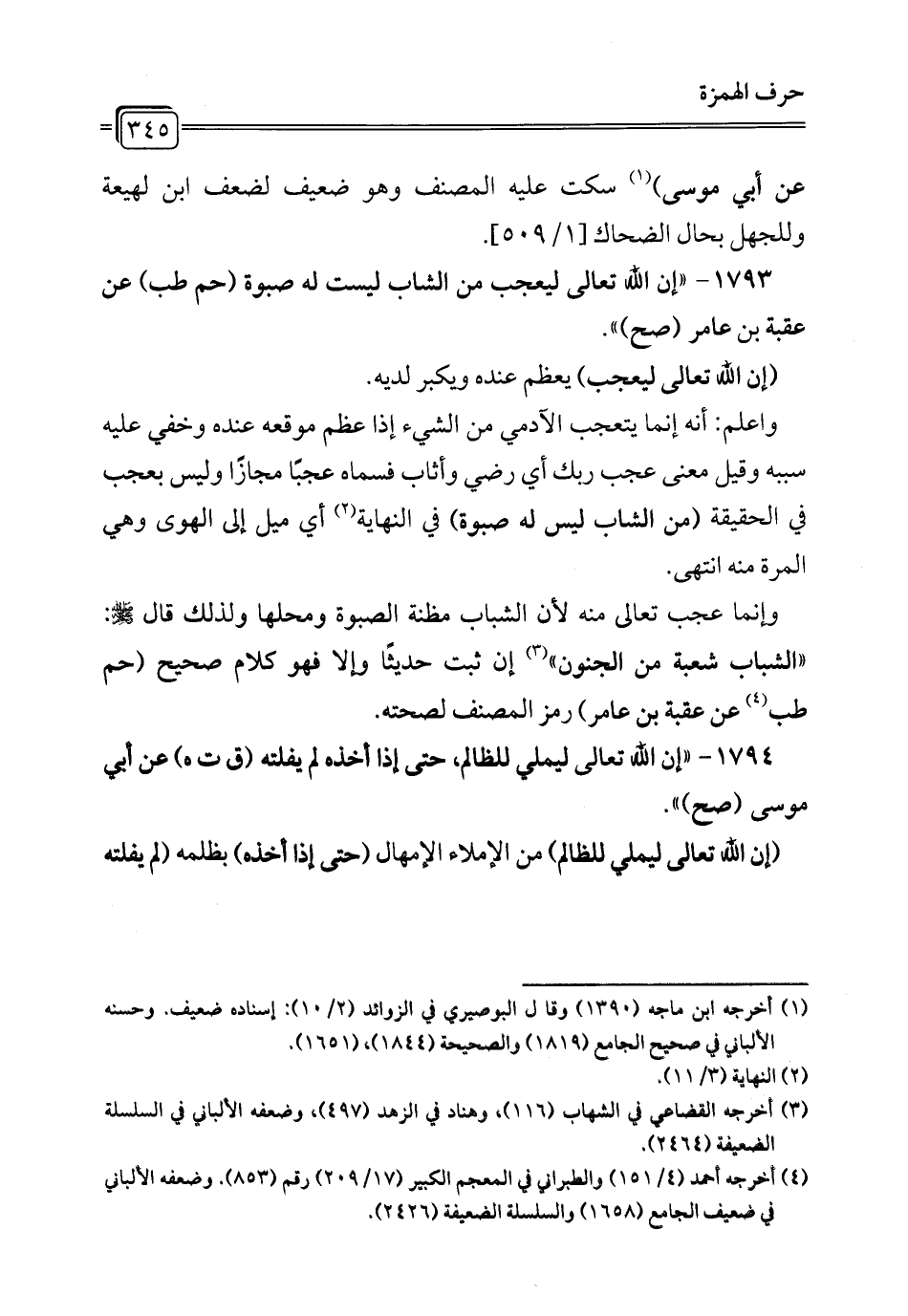 1793 - "إن الله تعالى ليعجب من الشاب ليست له صبوة (حم طب) عن عقبة بن عامر (صح) ".