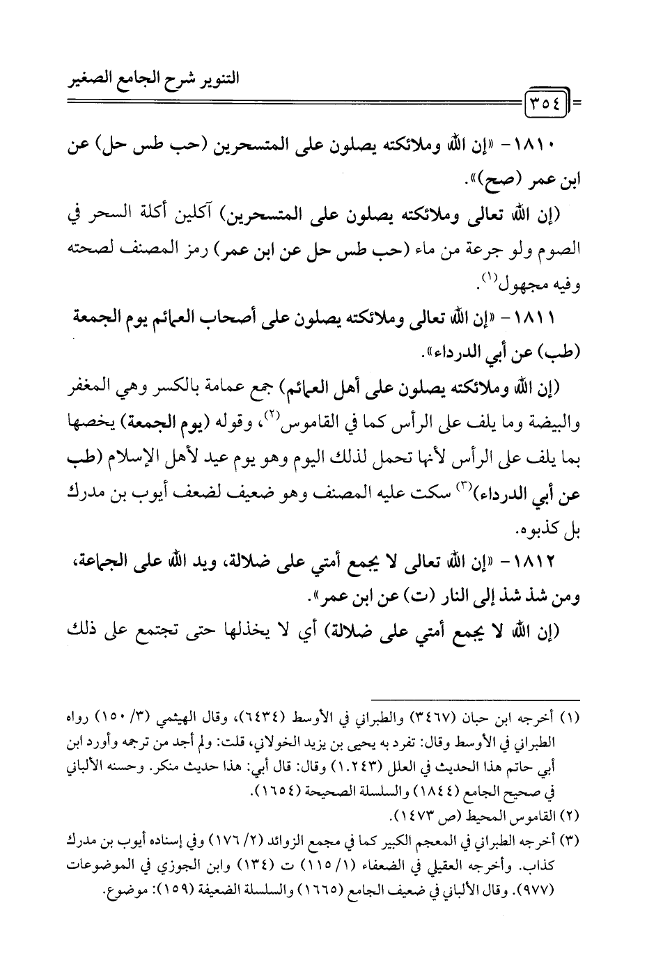 1811 - "إن الله تعالى وملائكته يصلون على أصحاب العمائم يوم الجمعة (طب) عن أبي الدرداء".