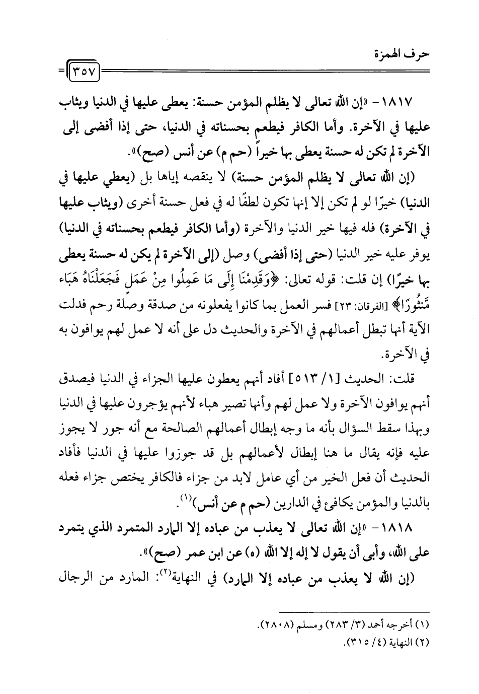 1817 - "إن الله تعالى لا يظلم المؤمن حسنة: يعطى عليها في الدنيا ويثاب عليها في الآخرة. وأما الكافر فيطعم بحسناته في الدنيا، حتى إذا أفضى إلى الآخرة لم تكن له حسنة بعطى بها خيراً (حم م) عن أنس (صح) ".