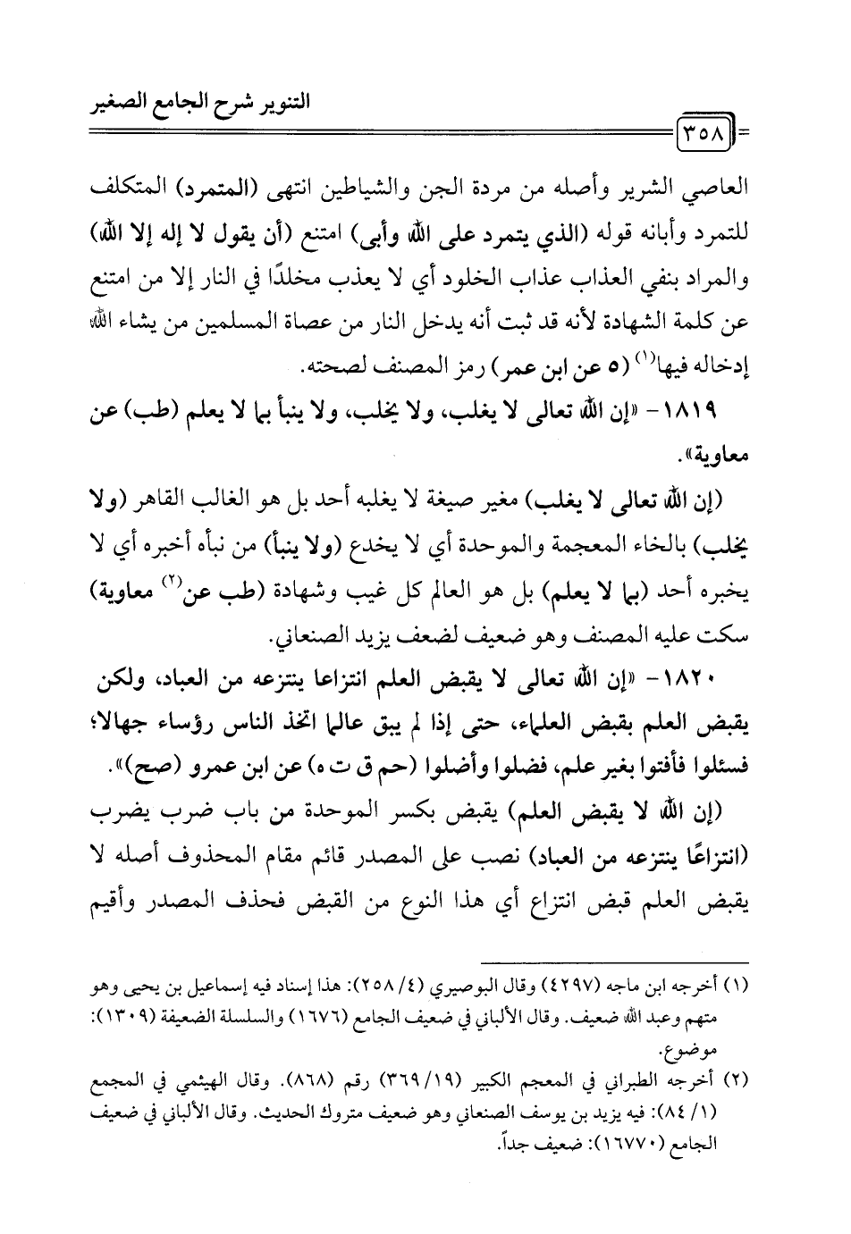 1820 - "إن الله تعالى لا يقبض العلم انتزاعا ينتزعه من العباد، ولكن يقبض العلم بقبض العلماء، حتى إذا لم يبق عالماً اتخذ الناس رؤساء جهالا؛ فسئلوا فأفتوا بغير علم، فضلوا وأضلوا (حم ق ت هـ) عن ابن عمرو (صح) ".
