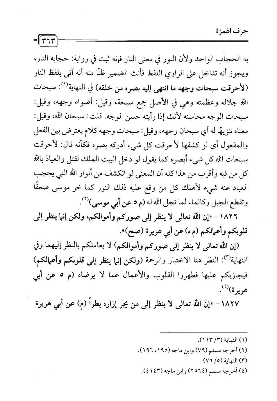 1826 - "إن الله تعالى لا ينظر إلى صوركم وأموالكم، ولكن إنما ينظر إلى قلوبكم وأعمالكم (م هـ) عن أبي هريرة (صح) ".
