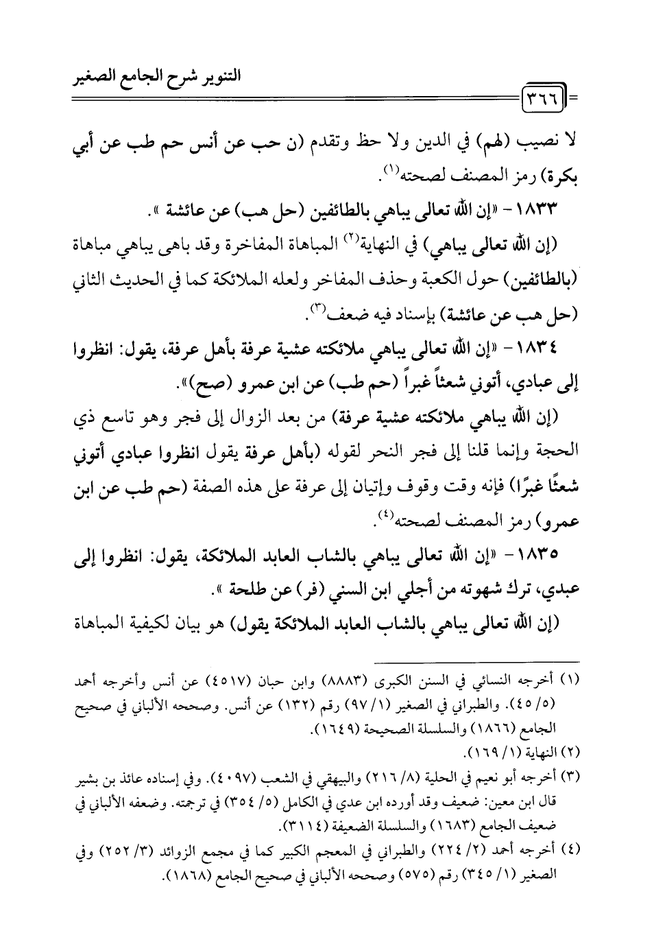 1834 - "إن الله تعالى يباهي ملائكته عشية عرفة بأهل عرفة، يقول: انظروا إلى عبادي، أتوني شعثاً غبراً (حم طب) عن ابن عمرو (صح) ".