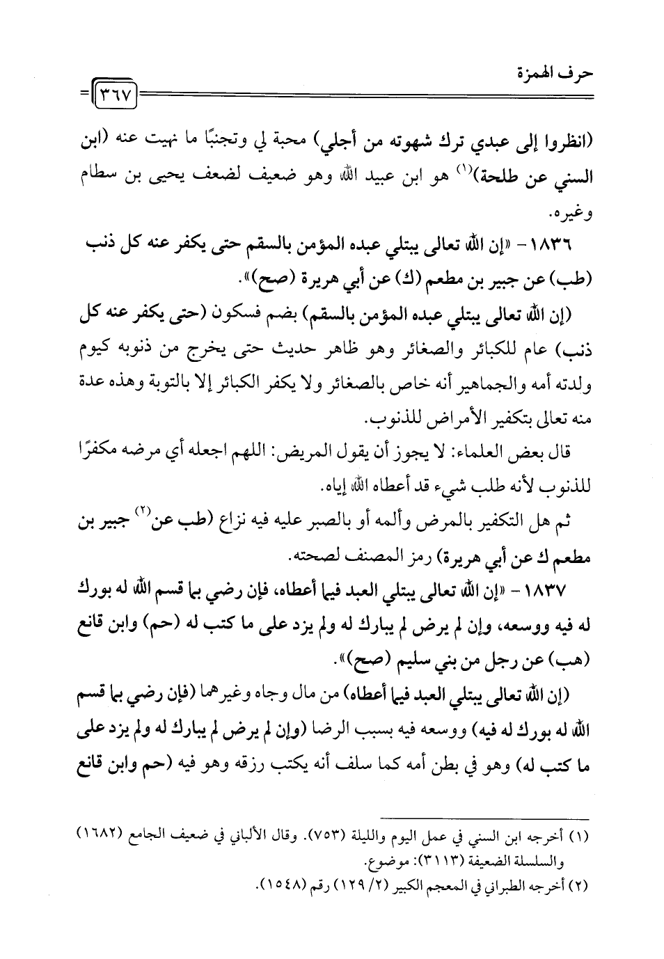 1836 - "إن الله تعالى يبتلي عبده المؤمن بالسقم حتى يكفر عنه كل ذنب (طب) عن جبير بن مطعم (ك) عن أبي هريرة (صح) ".