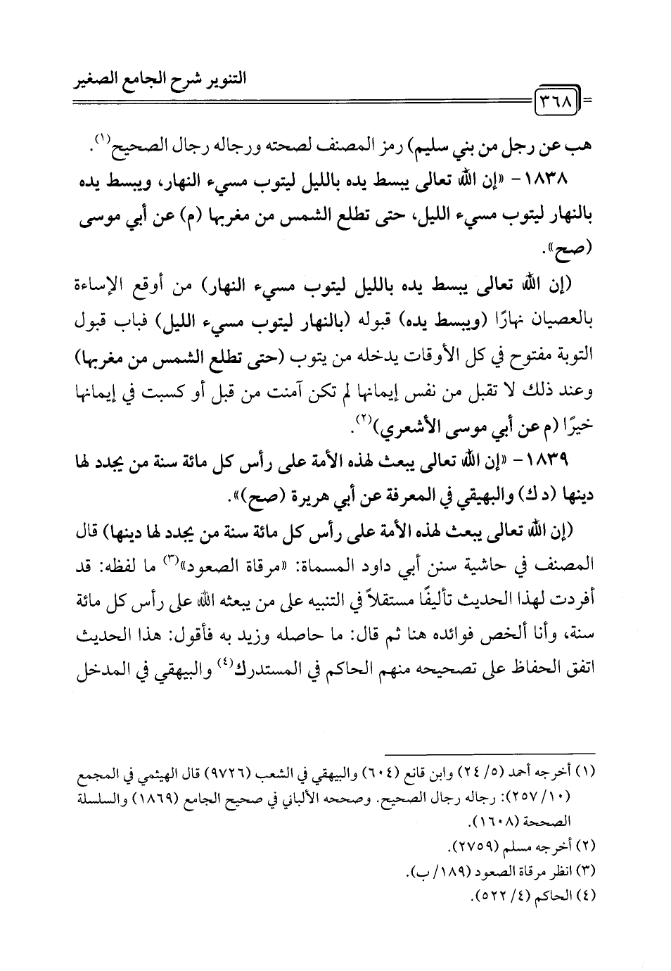 1839 - "إن الله تعالى يبعث لهذه الأمة على رأس كل مائة سنة من يجدد لها دينها (د ك) والبيهقي في المعرفة عن أبي هريرة (صح) ".