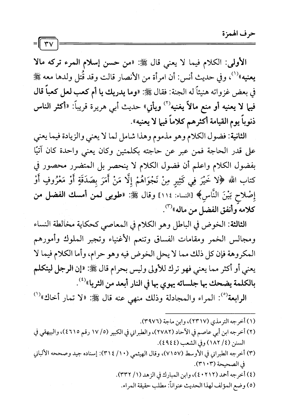 الأولى: الكلام فيما لا يعني قال - صلى الله عليه وسلم -: "من حسن إسلام المرء تركه ما لا يعنيه" (¬1)، وفي حديث أنس: أن امرأة من الأنصار قالت وقد قُتل ولدها معه - صلى الله عليه وسلم - في بعض غزواته هنيئًا له الجنة: فقال - صلى الله عليه وسلم -: "وما يدريك يا أم كعب لعل كعبًا قال فيما لا يعنيه أو منع مالًا يغنيه (¬2) ويأتي" حديث أبي هريرة قريبًا: "أكثر الناس ذنوبًا يوم القيامة أكثرهم كلامًا فيما لا يعنيه".