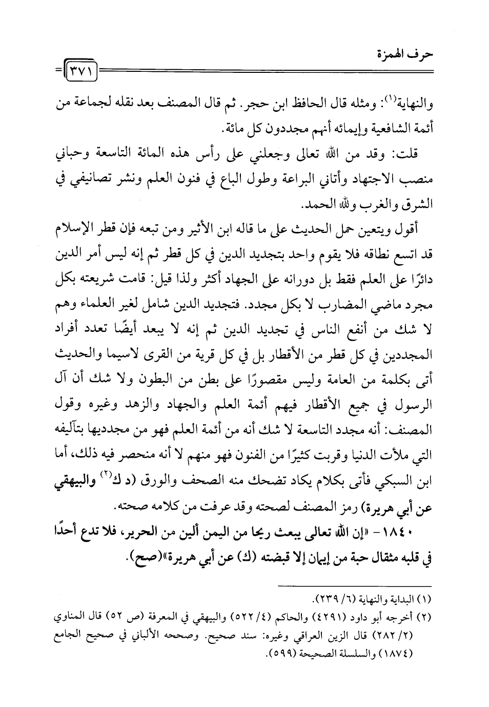 أقول ويتعين حمل الحديث على ما قاله ابن الأثير ومن تبعه فإن قطر الإِسلام قد اتسع نطاقه فلا يقوم واحد بتجديد الدين في كل قطر ثم إنه ليس أمر الدين دائرًا على العلم فقط بل دورانه على الجهاد أكثر ولذا قيل: قاصت شريعته بكل مجرد ماضي المضارب لا بكل مجدد. فتجديد الدين شامل لغير العلماء وهم لا شك من أنفع الناس في تجديد الدين ثم إنه لا يبعد أيضًا تعدد أفراد المجددين في كل قطر من الأقطار بل في كل قرية من القرى لا سيما والحديث أتى بكلمة من العامة وليس مقصورًا على بطن من البطون ولا شك أن آل الرسول في جميع الأقطار فيهم أئمة العلم والجهاد والزهد وغيره وقول المصنف: أنه مجدد التاسعة لا شك أنه من أئمة العلم فهو من مجدديها بتآليفه التي ملأت الدنيا وقربت كثيراً من الفنون فهو منهم لا أنه منحصر فيه ذلك، أما ابن السبكي فأتى بكلام يكاد تضحك منه الصحف والورق (د ك (¬2) والبيهقي عن أبي هريرة) رمز المصنف لصحته وقد عرفت من كلامه صحته.