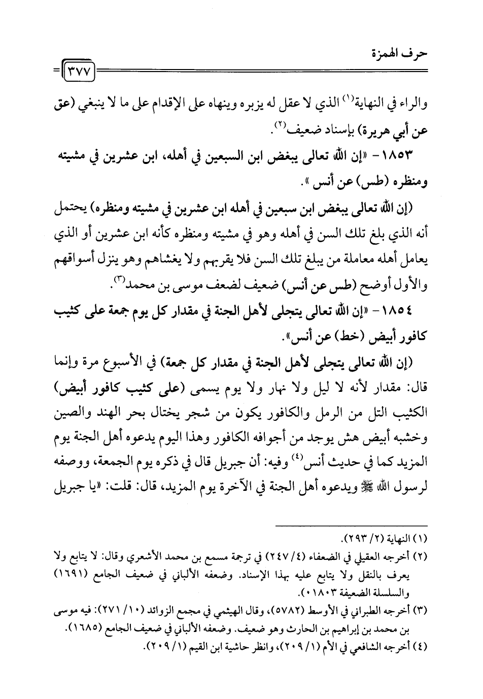 1854 - "إن الله تعالى يتجلى لأهل الجنة في مقدار كل يوم جمعة على كثيب كافور أبيض (خط) عن أنس ".