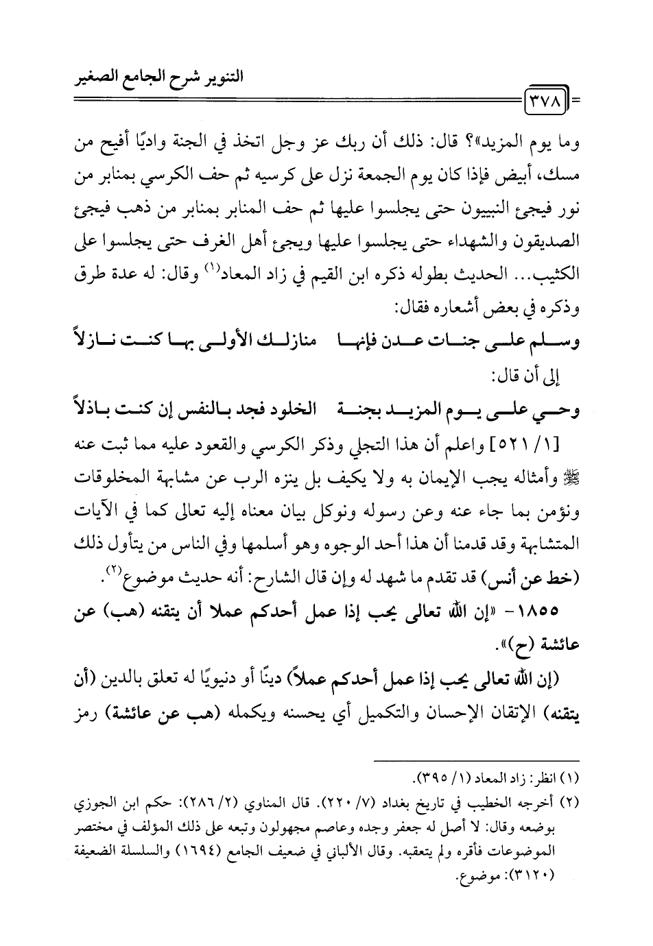 [1/ 521] واعلم أن هذا التجلي وذكر الكرسي والقعود عليه مما ثبت عنه - صلى الله عليه وسلم - وأمثاله يجب الإيمان به ولا يكيف بل ينزه الرب عن مشابهة المخلوقات ونؤمن بما جاء عنه وعن رسوله ونوكل بيان معناه إليه تعالى كما في الآيات المتشابهة وقد قدمنا أن هذا أحد الوجوه وهو أسلمها وفي الناس من يتأول ذلك (خط عن أنس) قد تقدم ما شهد له وإن قال الشارح: أنه حديث موضوع (¬2).