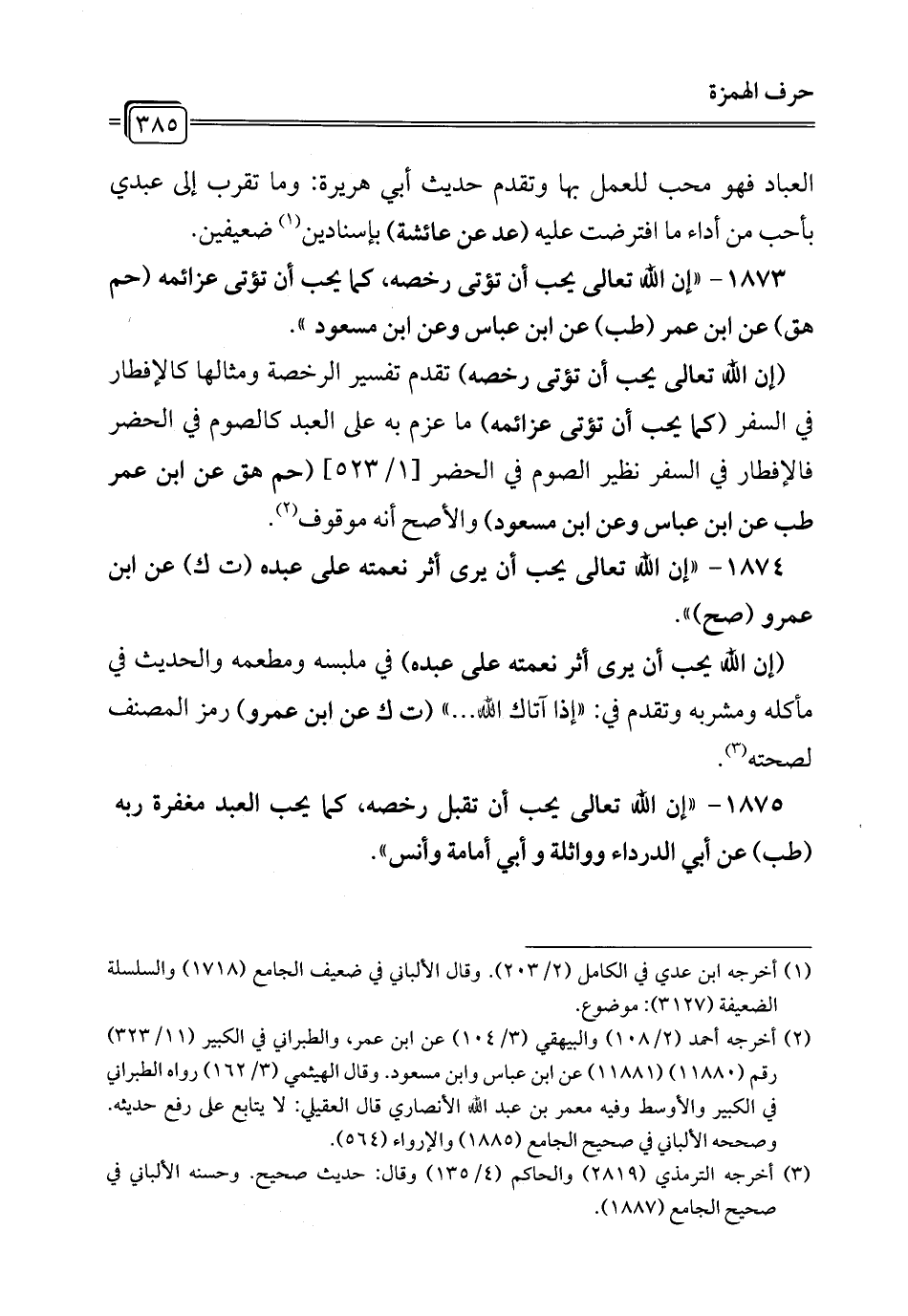 1873 - "إن الله تعالى يحب أن تؤتى رخصه كما يحب أن تؤتى عزائمه (حم هق) عن ابن عمر (طب) عن ابن عباس وعن ابن مسعود".