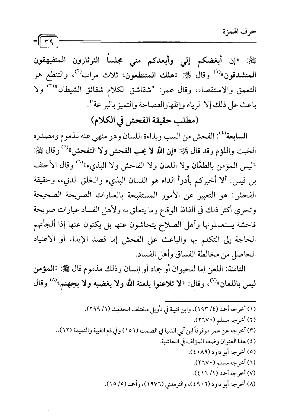 - صلى الله عليه وسلم -: "إن أبغضكم إلي وأبعدكم مني مجلسًا الثرثارون المتفيهقون المتشدقون" (¬1) وقال - صلى الله عليه وسلم -: "هلك المتنطعون" ثلاث مرات (¬2)، والتنطع هو التعمق والاستقصاء، وقال عمر: "شقاشق الكلام شقائق الشيطان" (¬3) ولا باعث على ذلك إلا الرياء وإظهار الفصاحة والتميز بالبراعة".