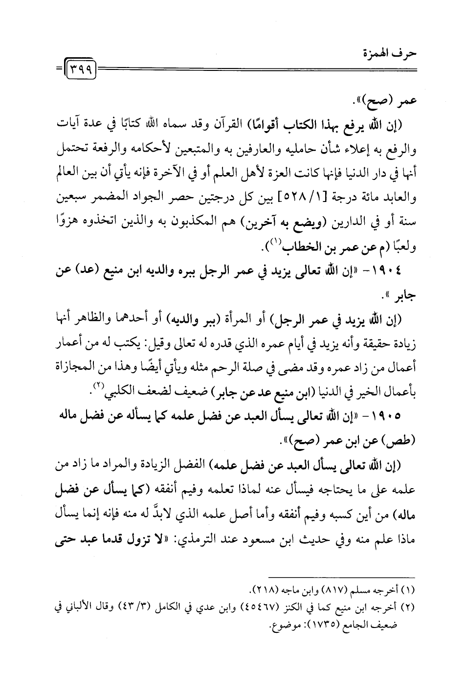 1905 - "إن الله تعالى يسأل العبد عن فضل علمه كما يسأله عن فضل ماله (طص) عن ابن عمر (صح) ".