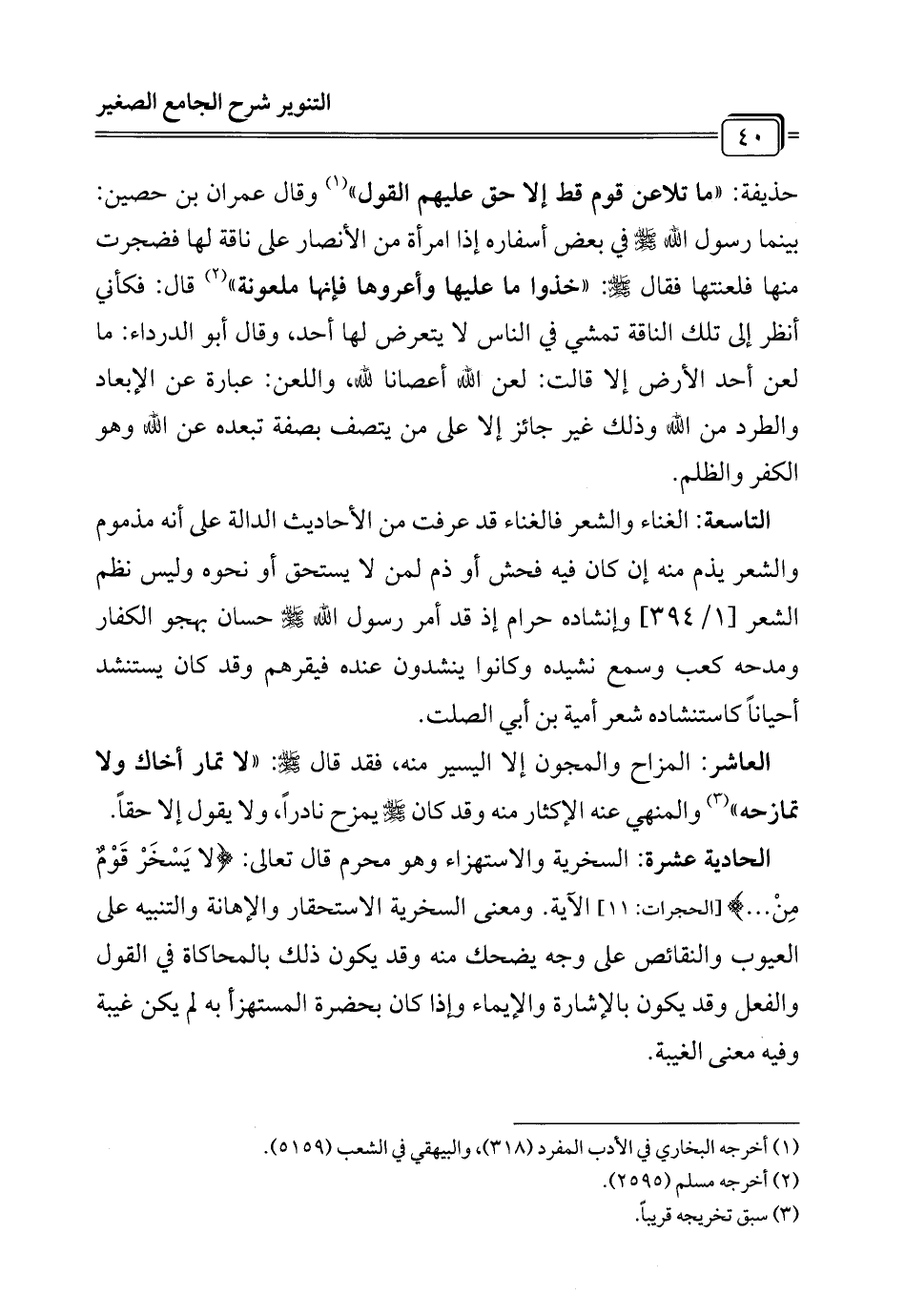 التاسعة: الغناء والشعر فالغناء قد عرفت من الأحاديث الدالة على أنه مذموم والشعر يذم منه إن كان فيه فحش أو ذم لمن لا يستحق أو نحوه وليس نظم الشعر [1/ 394] وإنشاده حرام إذ قد أمر رسول الله - صلى الله عليه وسلم - حسان بهجو الكفار ومدحه كعب وسمع نشيده وكانوا ينشدون عنده فيقرهم وقد كان يستنشد أحيانًا كاستنشاده شعر أمية بن أبي الصلت.