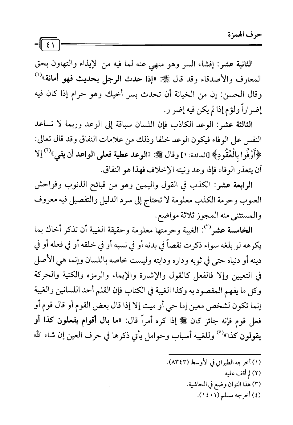 الثانية عشر: إفشاء السر وهو منهي عنه لما فيه من الإيذاء والتهاون بحق المعارف والأصدقاء وقد قال - صلى الله عليه وسلم -: "إذا حدث الرجل بحديث فهو أمانة" (¬1) وقال الحسن: إن من الخيانة أن تحدث بسر أخيك وهو حرام إذا كان فيه إضرارًا ولؤم إذا لم يكن فيه إضرار.