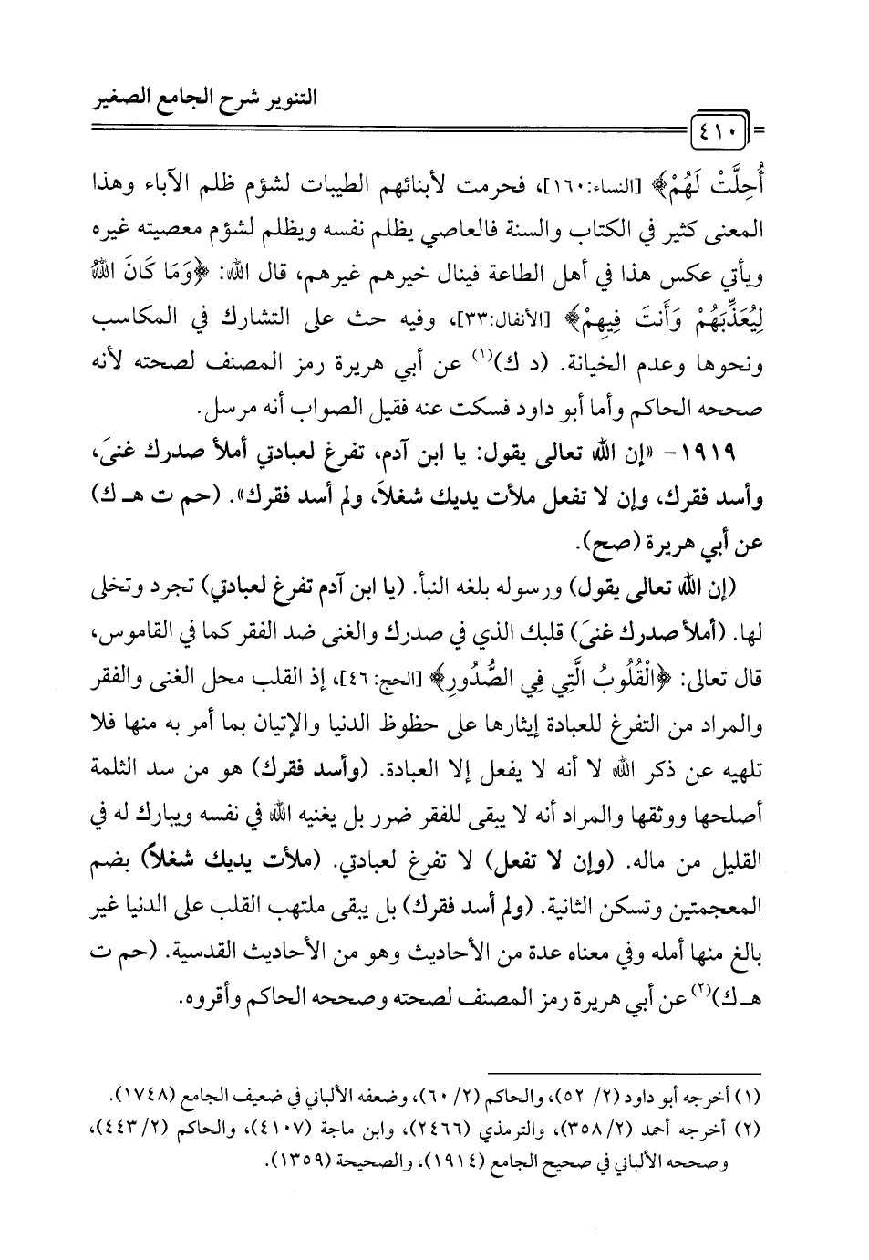 1919 - "إن الله تعالى يقول: يا ابن آدم، تفرغ لعبادتي أملأ صدرك غنَى، وأسد فقرك، وإن لا تفعل ملأت يديك شغلَا، ولم أسد فقرك". (حم ت هـ ك) عن أبي هريرة (صح).