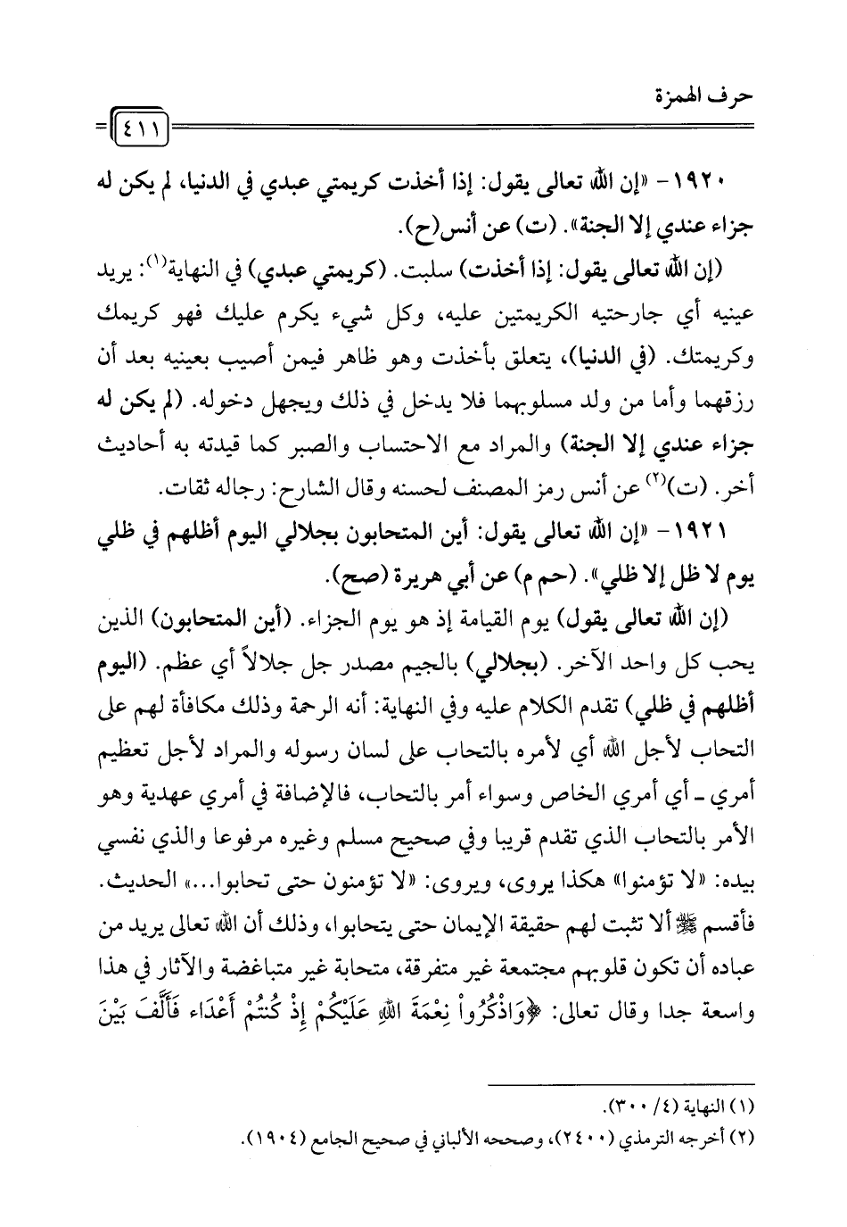 1920 - "إن الله تعالى يقول: إذا أخذت كريمتي عبدي في الدنيا، لم يكن له جزاء عندي إلا الجنة". (ت) عن أنس (ح).