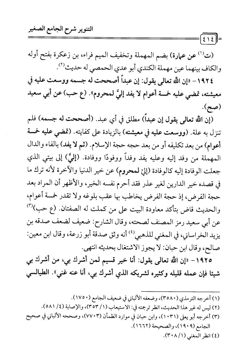 1924 - "إن الله تعالى يقول: إن عبداً أصححت له جسمه ووسعت عليه في معيشته، تمضي عليه خمسة أعوام لا يفد إليَّ لمحروم". (ع حب) عن أبي سعيد (صح).