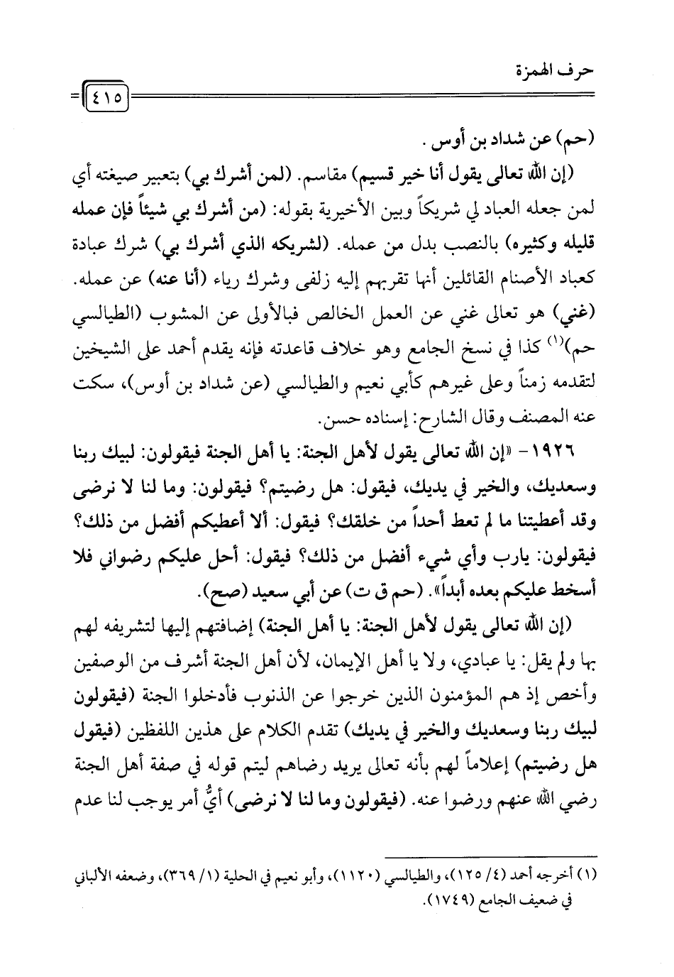 1926 - "إن الله تعالى يقول لأهل الجنة: يا أهل الجنة فيقولون: لبيك ربنا وسعديك، والخير في يديك فيقول: هل رضيتم؟ فيقولون: وما لنا لا نرضى وقد أعطيتنا ما لم تعط أحداً من خلقك؟ فيقول: ألا أعطيكم أفضل من ذلك؟ فيقولون: يا رب وأي شيء أفضل من ذلك؟ فيقول: أحل عليكم رضواني فلا أسخط عليكم بعده أبداً". (حم ق ت) عن أبي سعيد (صح).