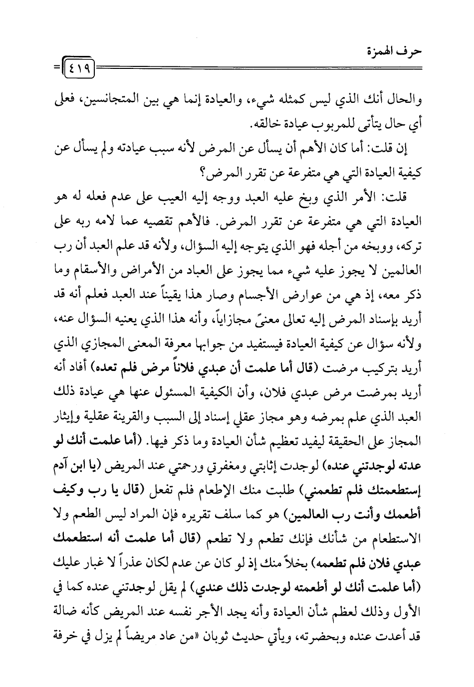 قلت: الأمر الذي وبخ عليه العبد ووجه إليه العيب على عدم فعله له هو العيادة التي هي متفرعة عن تقرر المرض. فالأهم تقصيه عما لامه ربه على تركه، ووبخه من أجله فهو الذي يتوجه إليه السؤال، ولأنه قد علم العبد أن رب العالمين لا يجوز عليه شيء مما يجوز على العباد من الأمراض والأسقام وما ذكر معه، إذ هي من عوارض الأجسام وصار هذا يقيناً عند العبد فعلم أنه قد أريد بإسناد المرض إليه تعالى معنىً مجازاياً، وأنه هذا الذي يعنيه السؤال عنه، ولأنه سؤال عن كيفية العيادة فيستفيد من جوابها معرفة المعنى المجازي الذي أريد بتركيب مرضت (قال أما علمت أن عبدي فلاناً مرض فلم تعده) أفاد أنه أريد بمرضت مرض عبدي فلان، وأن الكيفية المسئول عنها هي عيادة ذلك العبد الذي علم بمرضه وهو مجاز عقلي إسناد إلى السبب والقرينة عقلية وإيثار المجاز على الحقيقة ليفيد تعظيم شأن العيادة وما ذكر فيها. (أما علمت أنك لو عدته لوجدتني عنده) لوجدت إثابتي ومغفرتي ورحمتي عند المريض (يا ابن آدم إستطعمتك فلم تطعمني) طلبت منك الأطعام فلم تفعل (قال يا رب وكيف أطعمك وأنت رب العالمين) هو كما سلف تقريره فإن المواد ليس الطعم ولا الاستطعام من شأنك فإنك تطعم ولا تطعم (قال أما علمت أنه استطعمك عبدي فلان فلم تطعمه) بخلاً منك إذ لو كان عن عدم لكان عذراً لا غبار عليك (أما علمت أنك لو أطعمته لوجدت ذلك عندي) لم يقل لوجدتني عنده كما في الأول وذلك لعظم شأن العيادة وأنه يجد الأجر نفسه عند المريض كأنه ضالة قد أعدت عنده وبحضرته، ويأتي حديث ثوبان "من عاد مريضاً لم يزل في خرفة