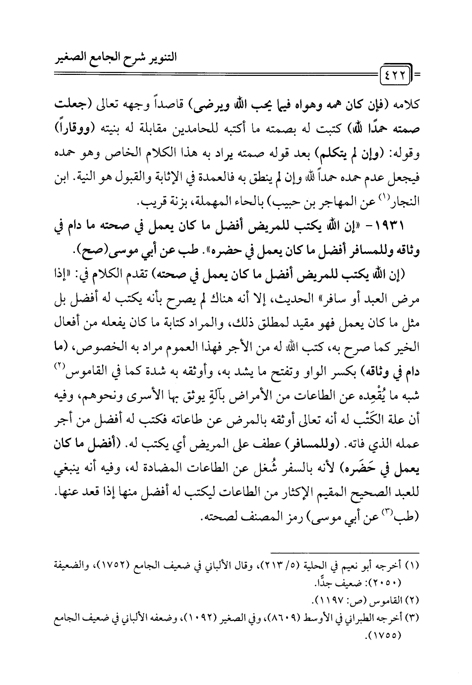 1931 - "إن الله يكتب للمريض أفضل ما كان يعمل في صحته ما دام في وثاقه وللمسافر أفضل ما كان يعمل في حضره". طب عن أبي موسى (صح).
