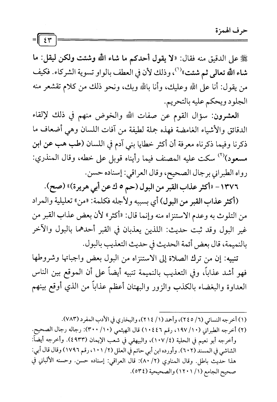 1376 - "أكثر عذاب القبر من البول (حم 5 ك عن أبي هريرة) " (صح).