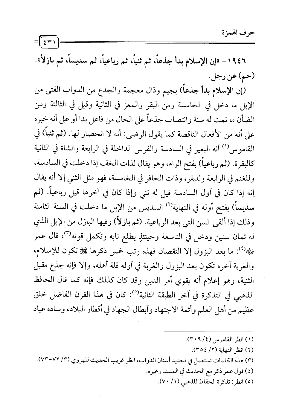 1946 - "إن الإِسلام بدأ جذعاً، ثم ثنياً، ثم رباعياً، ثم سديساً، ثم بازلاً". (حم) عن رجل.