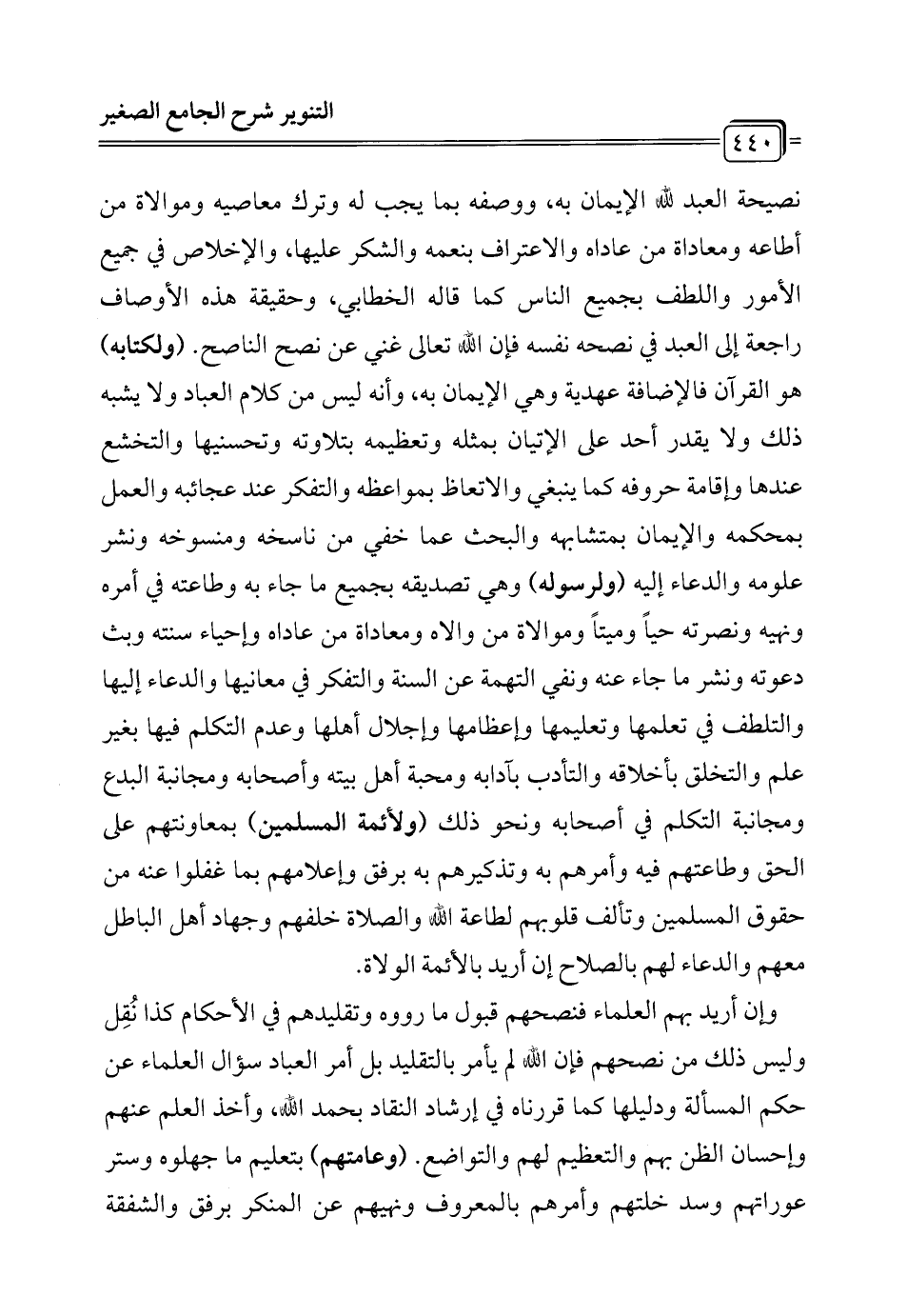 وإن أريد بهم العلماء فنصحهم قبول ما رووه وتقليدهم في الأحكام كذا نُقِل وليس ذلك من نصحهم فإن الله لم يأمر بالتقليد بل أمر العباد سؤال العلماء عن حكم المسألة ودليلها كما قررناه في إرشاد النقاد بحمد الله، وأخذ العلم عنهم وإحسان الظن بهم والتعظيم لهم والتواضع. (وعامتهم) بتعليم ما جهلوه وستر عوراتهم وسد خلتهم وأمرهم بالمعروف ونهيهم عن المنكر برفق والشفقة