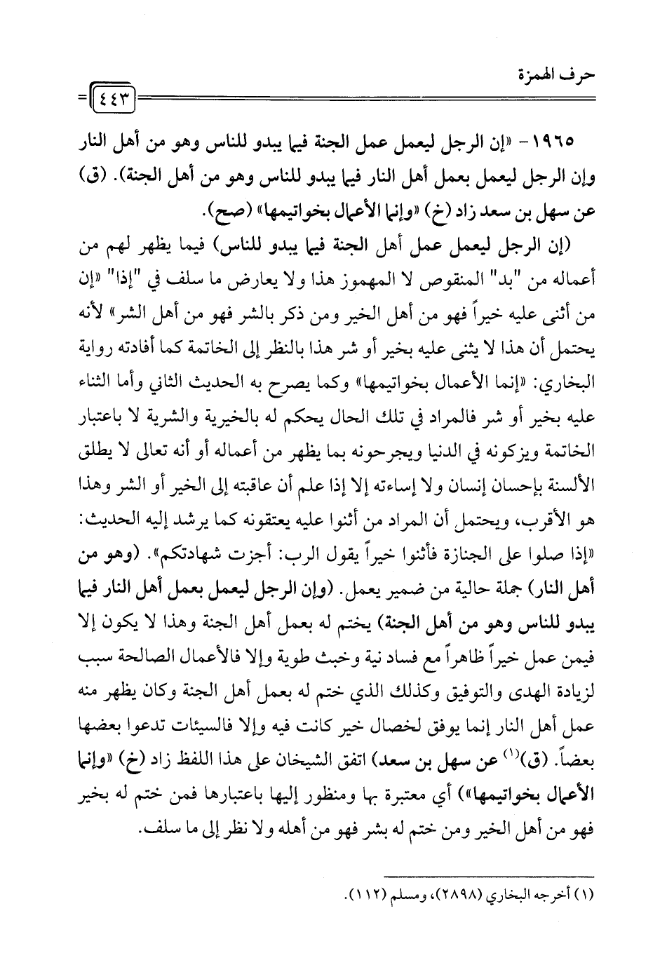 1965 - "إن الرجل ليعمل عمل الجنة فيما يبدو للناس وهو من أهل النار وإن الرجل ليعمل بعمل أهل النار فيما يبدو للناس وهو من أهل الجنة). (ق) عن سهل بن سعد زاد (خ) "وإنما الأعمال بخواتيمها" (صح).