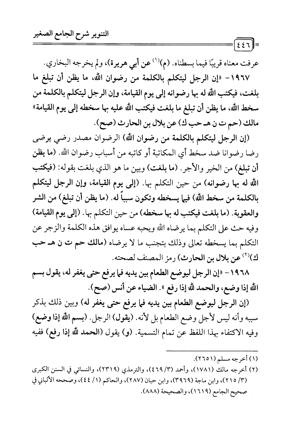 1967 - "إن الرجل ليتكلم بالكلمة من رضوان الله، ما يظن أن تبلغ ما بلغت، فيكتب الله له بها رضوانه إلى يوم القيامة, وإن الرجل ليتكلم بالكلمة من سخط الله، ما يظن أن تبلغ ما بلغت فيكتب الله عليه بها سخطه إلى يوم القيامة" مالك (حم ت ن هـ حب ك) عن بلال بن الحارث (صح).