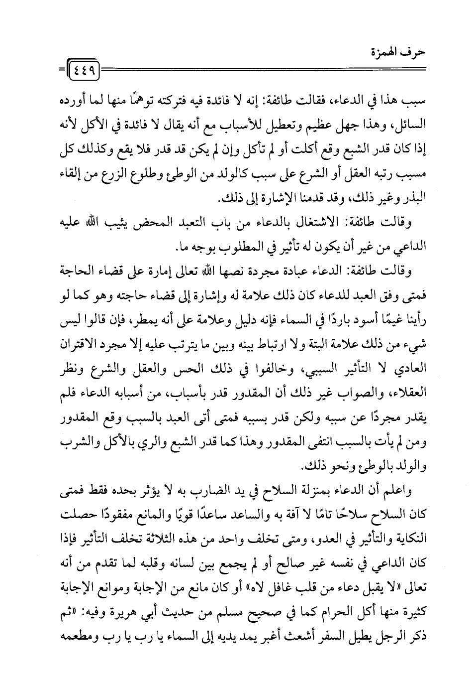 سبب هذا في الدعاء، فقالت طائفة: إنه لا فائدة فيه فتركته توهمًا منها لما أورده السائل، وهذا جهل عظيم وتعطيل للأسباب مع أنه يقال لا فائدة في الأكل لأنه إذا كان قدر الشبع وقع أكلت أو لم تأكل وإن لم يكن قد قدر فلا يقع وكذلك كل مسبب رتبه العقل أو الشرع على سبب كالولد من الوطئ وطلوع الزرع من إلقاء البذر وغير ذلك، وقد قدمنا الإشارة إلى ذلك.