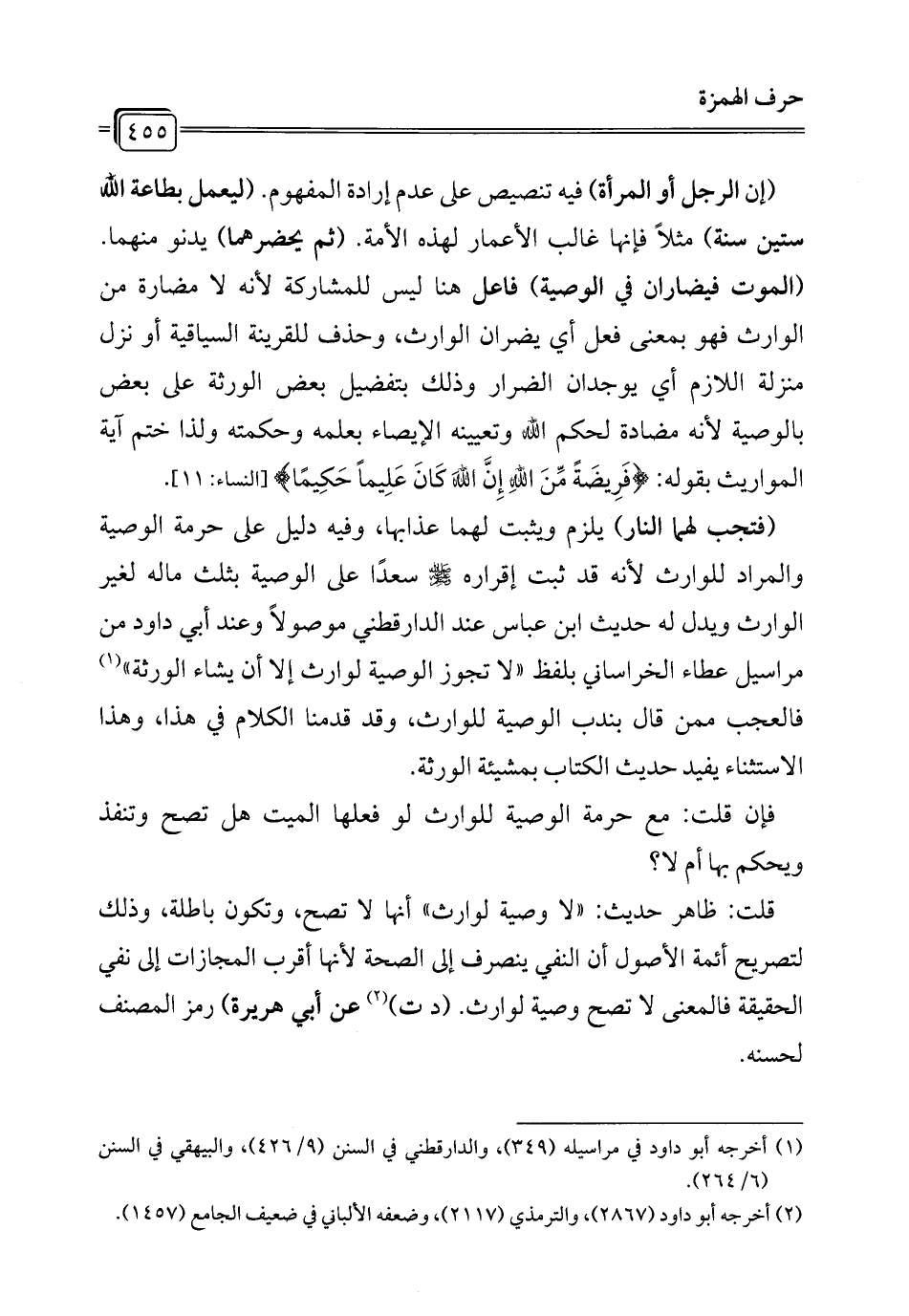 (إن الرجل أو المرأة) فيه تنصيص على عدم إرادة المفهوم. (ليعمل بطاعة الله ستين سنة) مثلاً فإنها غالب الأعمار لهذه الأمة. (ثم يحضرهما) يدنو منهما. (الموت فيضاران في الوصية) فاعل هنا ليس للمشاركة لأنه لا مضارة من الوارث فهو بمعنى فعل أي يضران الوارث، وحذف للقرينة السياقية أو نزل منزلة اللازم أي يوجدان الضرار وذلك بتفضيل بعض الورثة على بعض بالوصية لأنه مضادة لحكم الله وتعيينه الإيصاء بعلمه وحكمته ولذا ختم آية المواريث بقوله: {فَرِيضَةً مِّنَ اللهِ إِنَّ اللهَ كَانَ عَلِيماً حَكِيمًا} [النساء: 11].