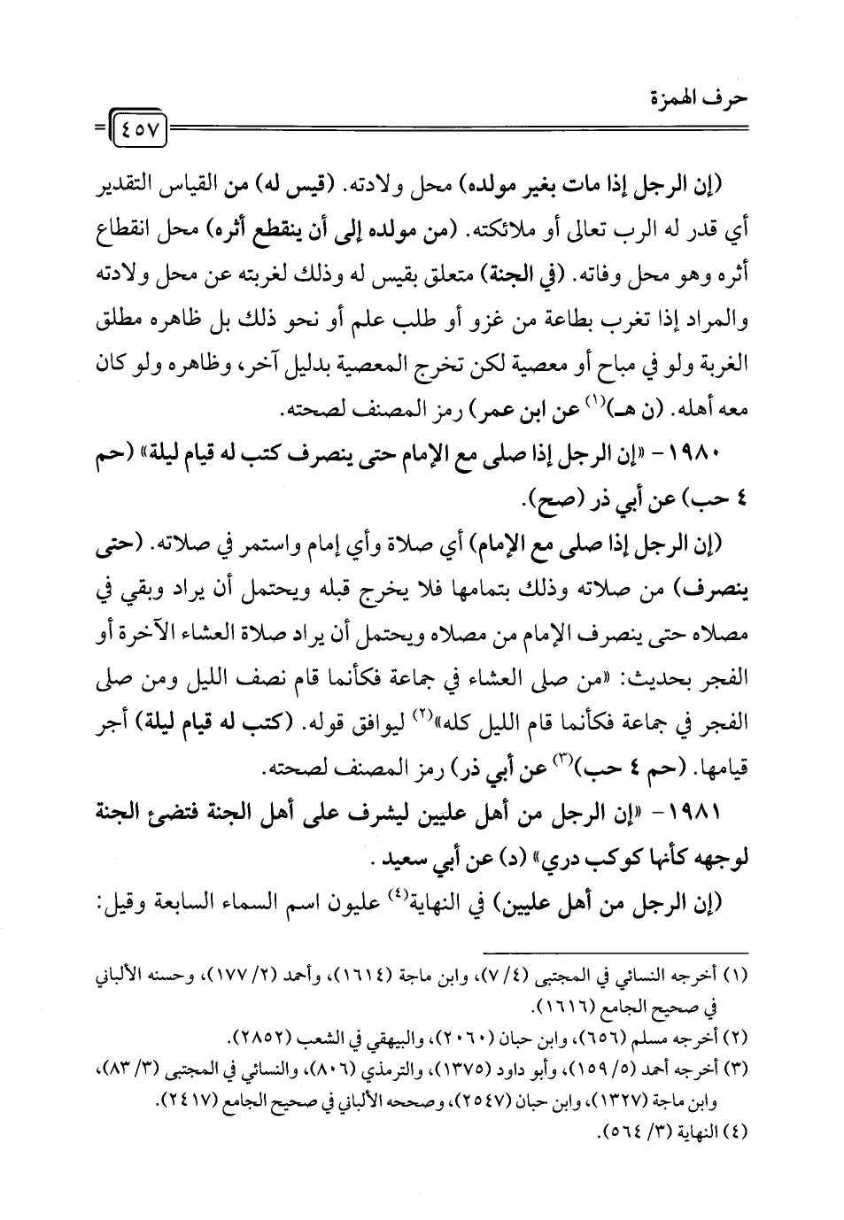 1980 - "إن الرجل إذا صلى مع الإِمام حتى ينصرف كتب له قيام ليلة" (حم 4 حب) عن أبي ذر (صح).