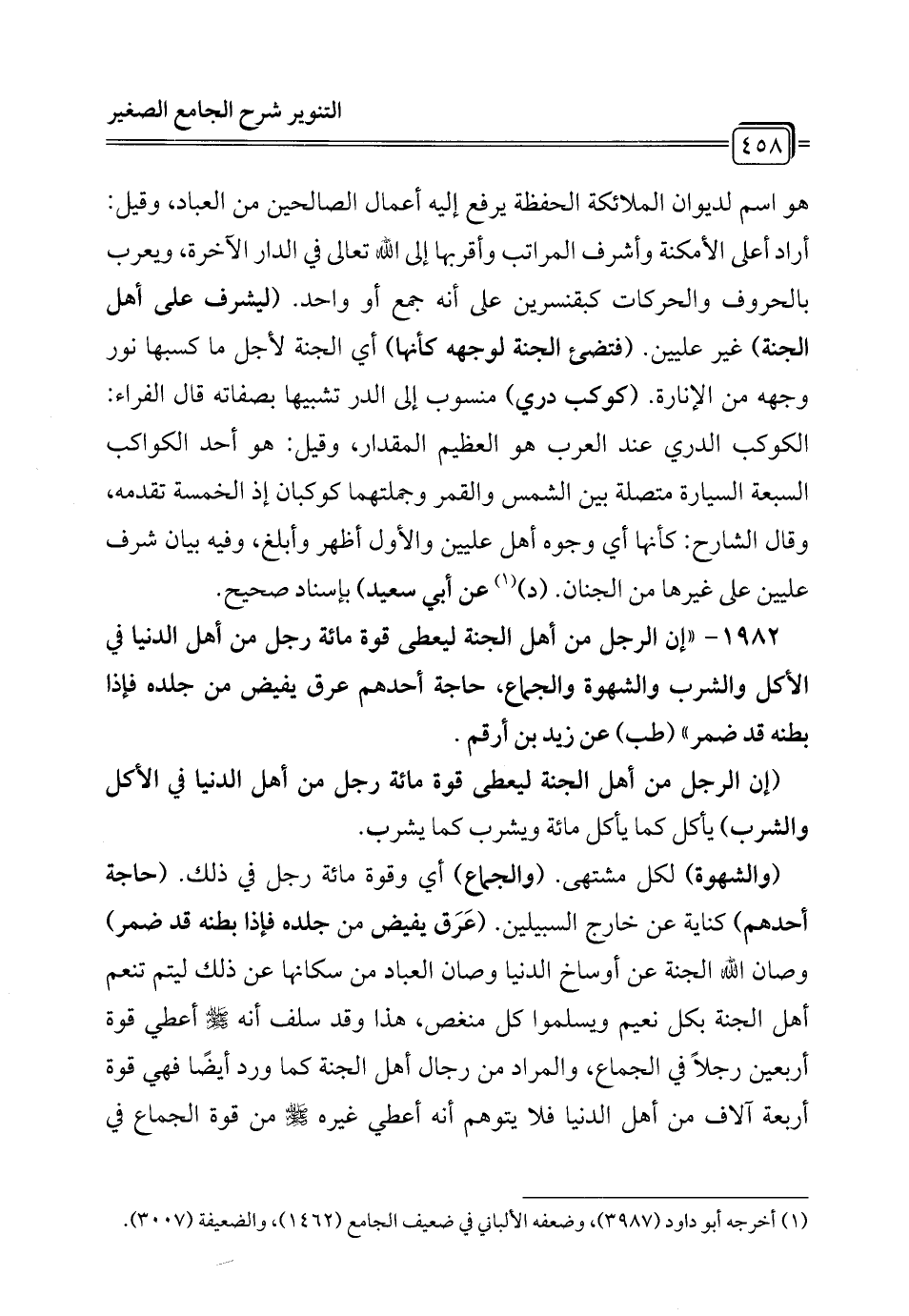 1982 - "إن الرجل من أهل الجنة ليعطى قوة مائة رجل من أهل الدنيا في الأكل والشرب والشهوة والجماع، حاجة أحدهم عرق يفيض من جلده فإذا بطنه قد ضمر" (طب) عن زيد بن أرقم.