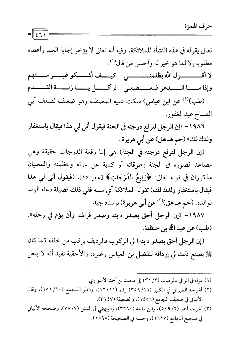 1986 - "إن الرجل لترفع درجته في الجنة فيقول أنى لي هذا فيقال باستغفار ولدك لك" (حم هـ هق) عن أبي هريرة.