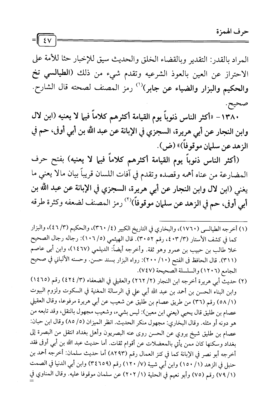 1380 - "أكثر الناس ذنوبًا يوم القيامة أكثرهم كلامًا فيما لا يعنيه (ابن لال وابن النجار عن أبي هريرة السجزي في الإبانة عن عبد الله بن أبي أوفى، حم في الزهد عن سلمان موقوفًا) " (ض).