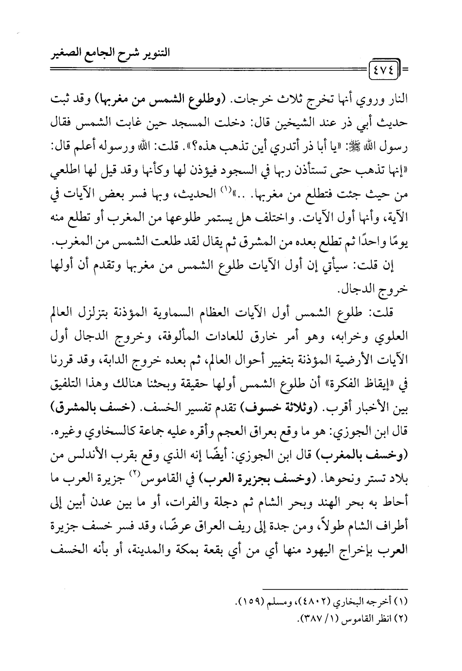 قلت: طلوع الشمس أول الآيات العظام السماوية المؤذنة بتزلزل العالم العلوي وخرابه، وهو أمر خارق للعادات المألوفة، وخروج الدجال أول الآيات الأرضية المؤذنة بتغيير أحوال العالم، ثم بعده خروج الدابة، وقد قررنا في "إيقاظ الفكرة" أن طلوع الشمس أولها حقيقة وبحثنا هنالك وهذا التلفيق بين الأخبار أقرب. (وثلاثة خسوف) تقدم تفسير الخسف. (خسف بالمشرق) قال ابن الجوزي: هو ما وقع بعراق العجم وأقره عليه جماعة كالسخاوي وغيره. (وخسف بالمغرب) قال ابن الجوزي: أيضًا إنه الذي وقع بقرب الأندلس من بلاد تستر ونحوها. (وخسف بجزيرة العرب) في القاموس (¬2) جزيرة العرب ما أحاط به بحر الهند وبحر الشام ثم دجلة والفرات، أو ما بين عدن أبين إلى أطراف الشام طولاً، ومن جدة إلى ريف العراق عرضًا، وقد فسر خسف جزيرة العرب بإخراج اليهود منها أي من أي بقعة بمكة والمدينة، أو بأنه الخسف