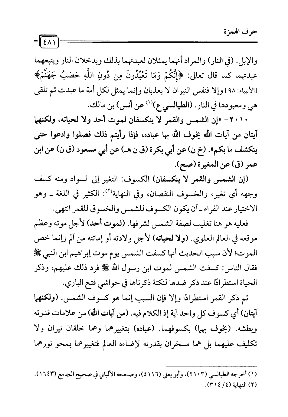 2010 - "إن الشمس والقمر لا ينكسفان لموت أحد ولا لحياته، ولكنهما آيتان من آيات الله يخوف الله بها عباده، فإذا رأيتم ذلك فصلوا وادعوا حتى ينكشف ما بكم". (خ ن) عن أبي بكرة (ق ن هـ) عن أبي مسعود (ق ن) عن ابن عمر (ق) عن المغيرة (صح).